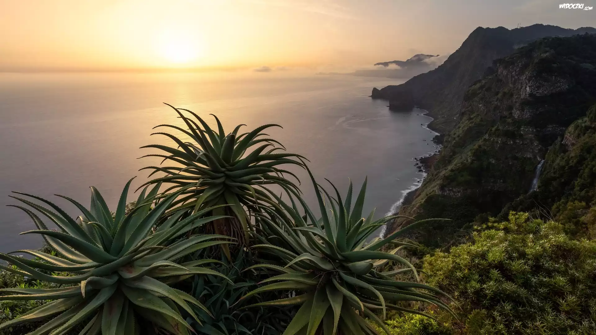 Zdjęcia, Portugalia, Madera, Morze, Wybrzeże, Góry, Aloes, Wschód słońca