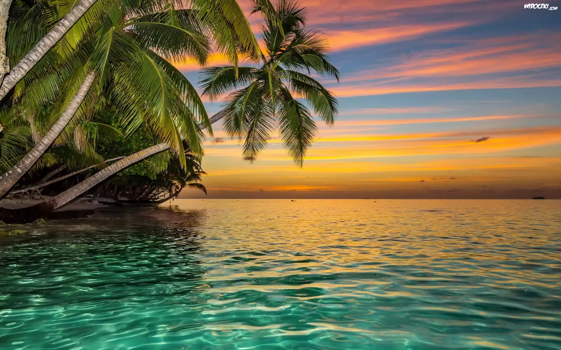 Zdjęcia, Zachód słońca, Morze, Pochylone, Palmy