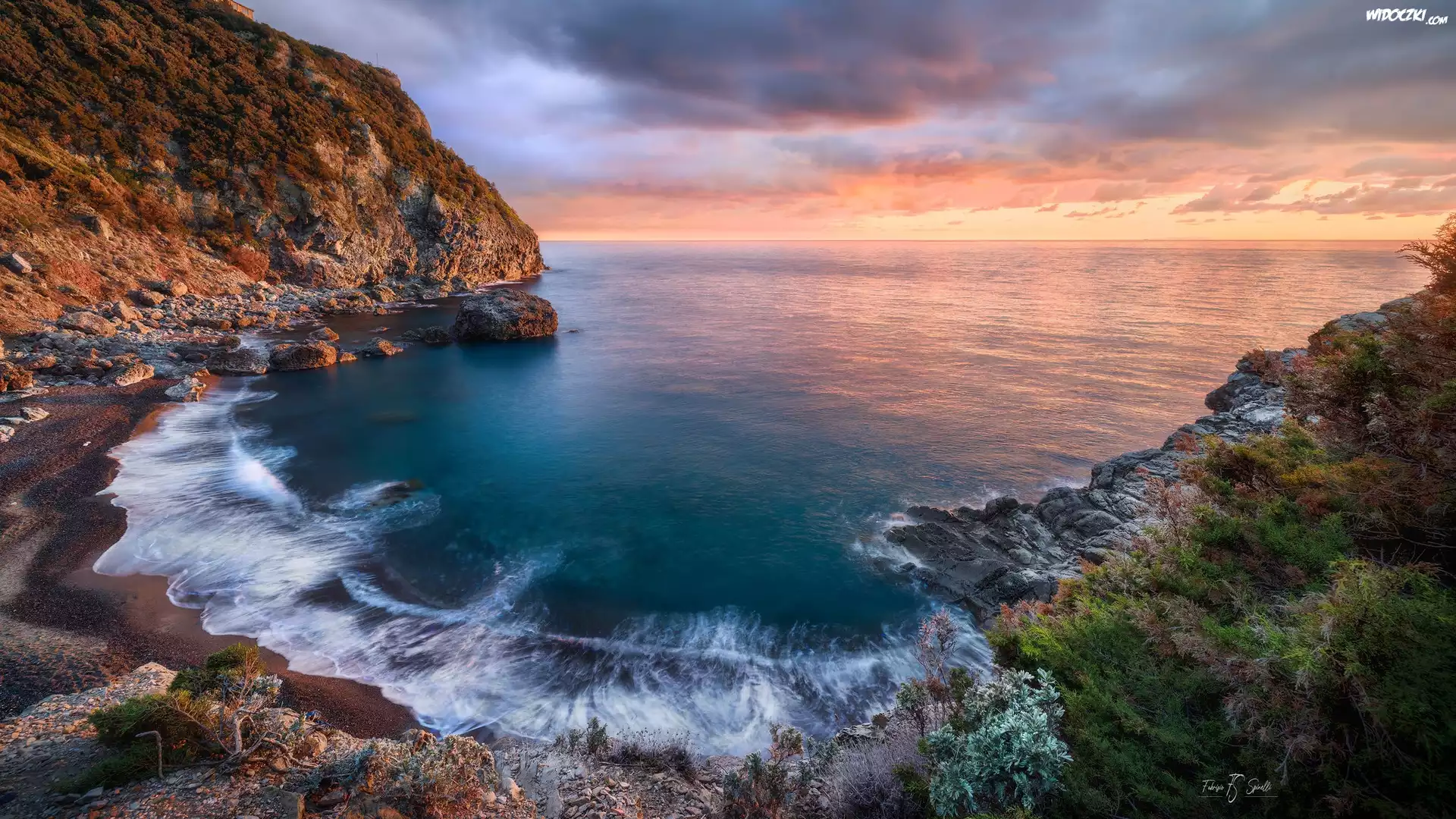 Zdjęcia, Wschód słońca, Morze, Skały, Rośliny