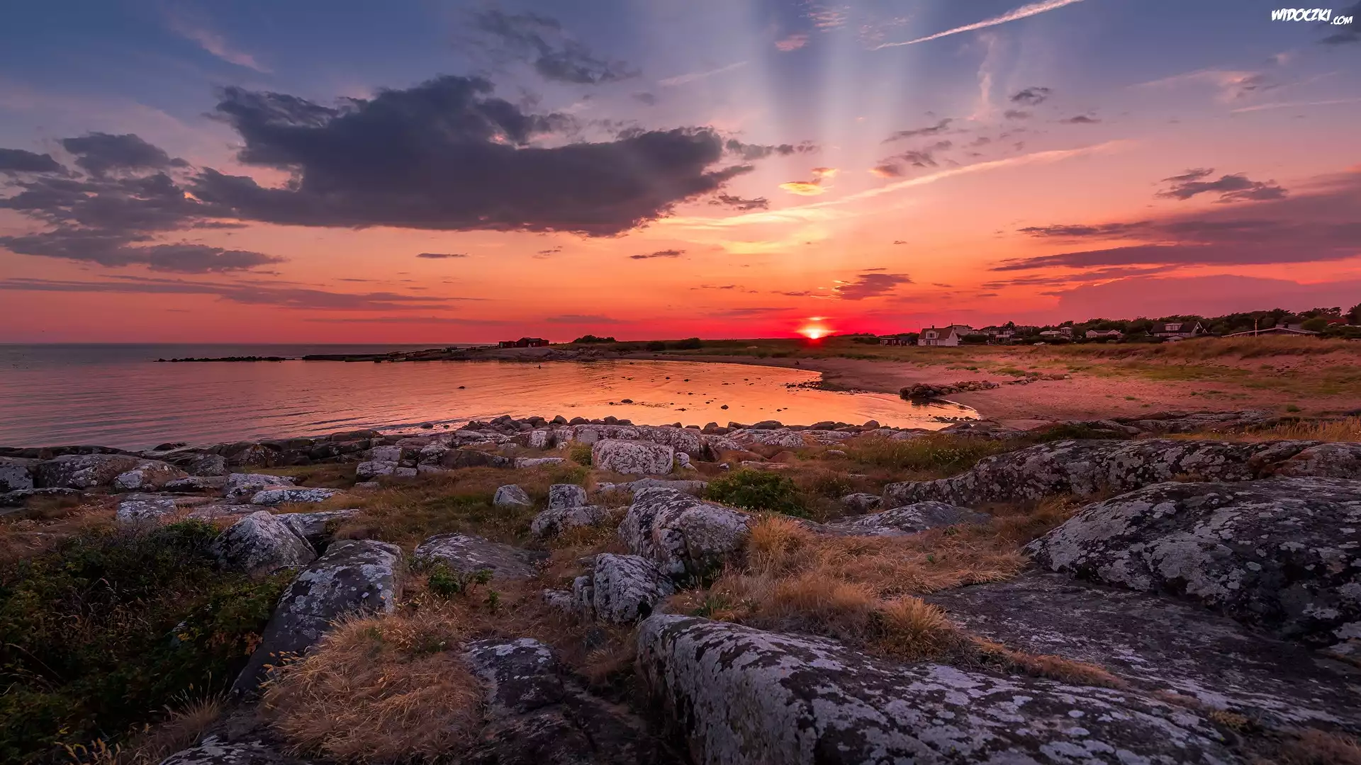 Zdjęcia, Zachód słońca, Wybrzeże, Zatoka, Skały, Kamienie, Domy, Morze