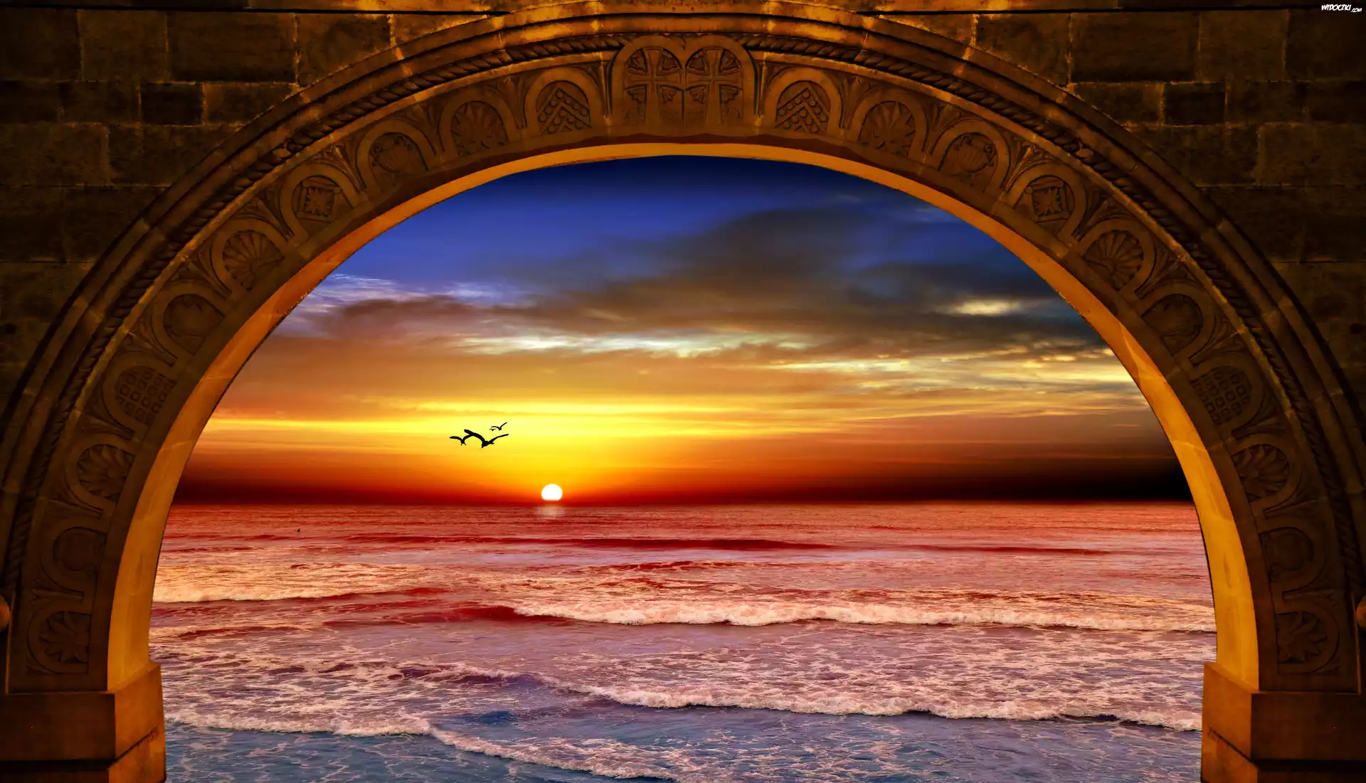 Łuk, Morze, Zachód, Słońca, Ptaki