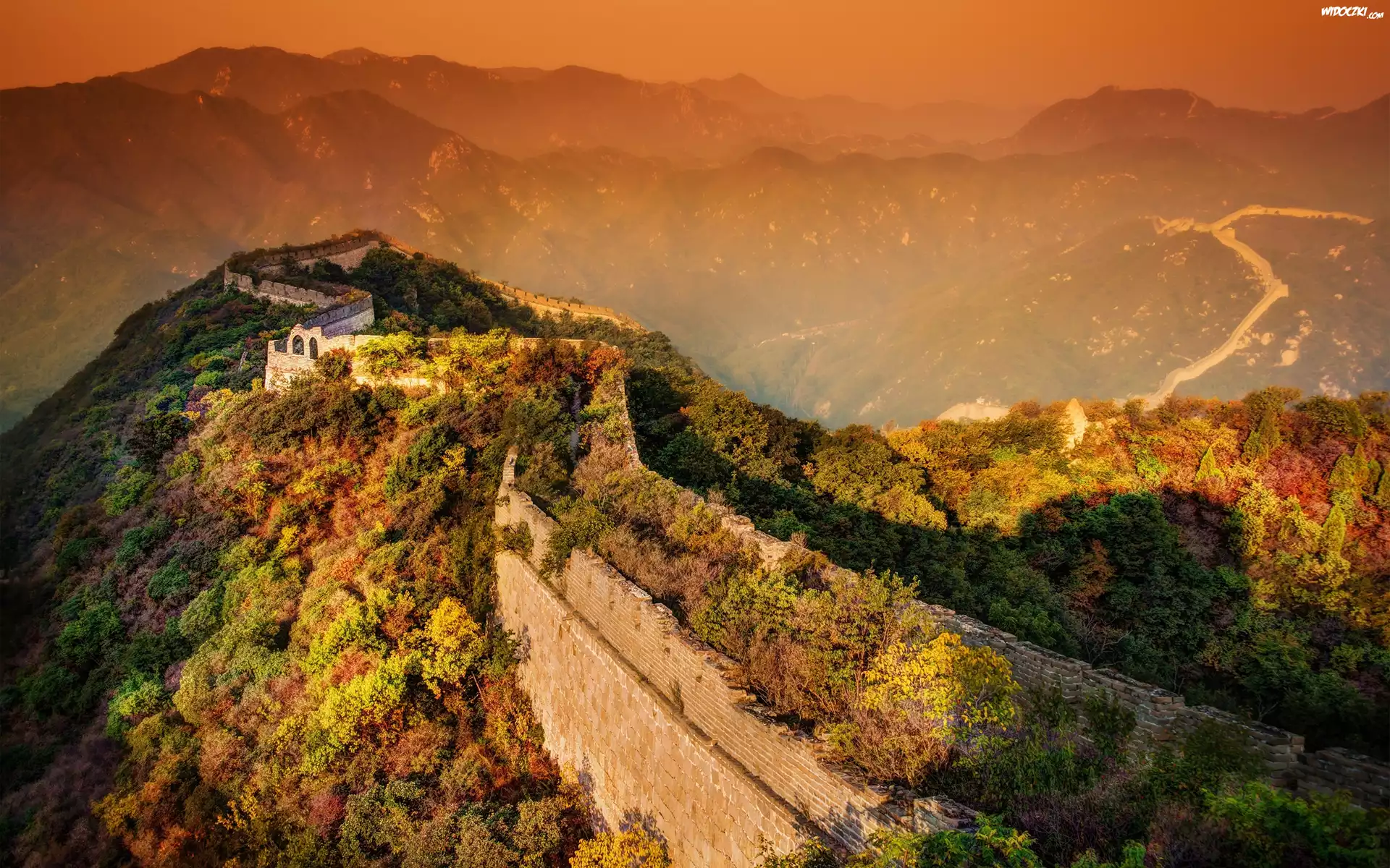 Chiny, Wielki Mur Chiński, Góry, Mgła, Zachód, Słońca