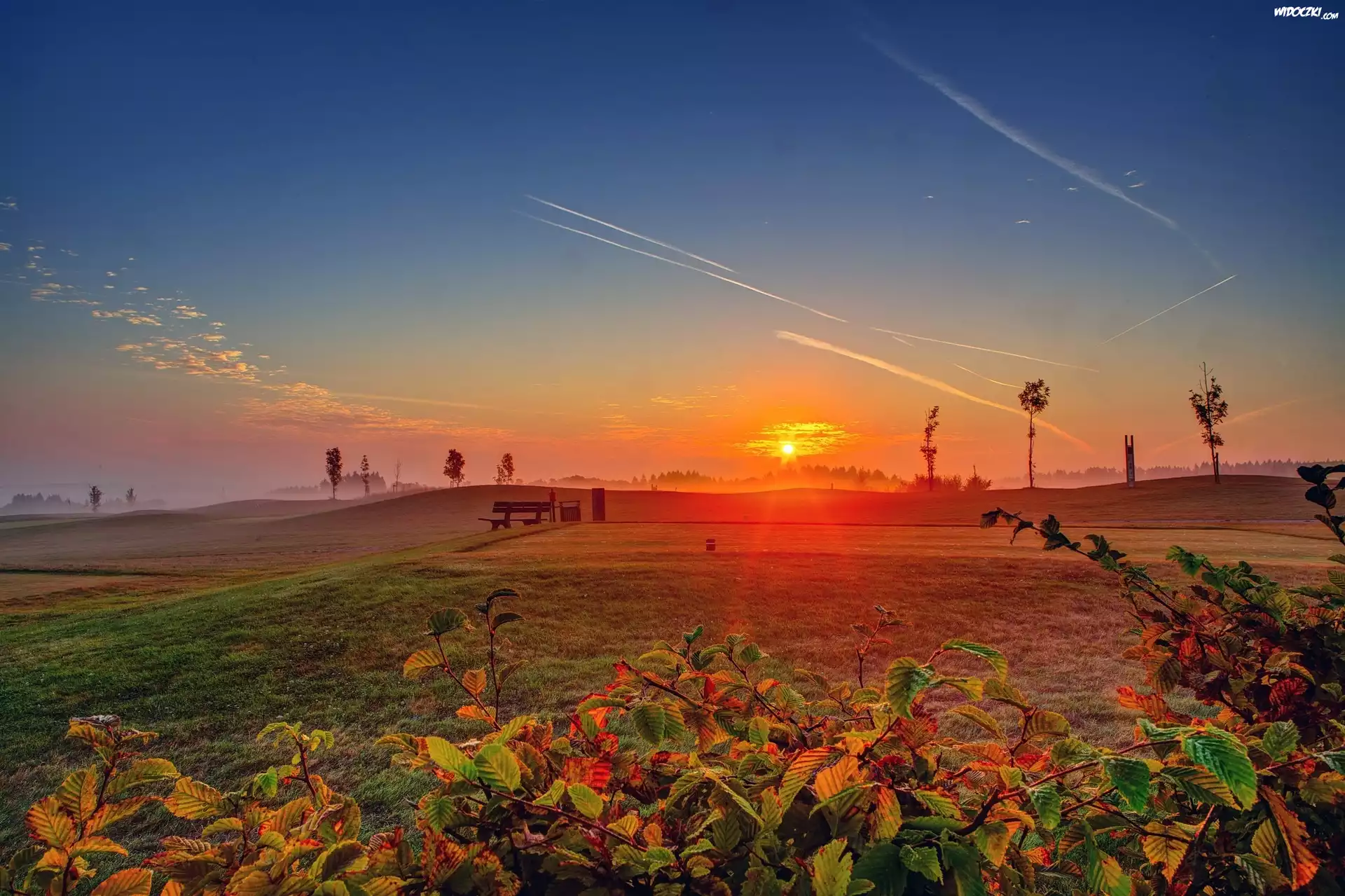 Zdjęcia, Łąka, Niebo, Zachód Słońca, Liście