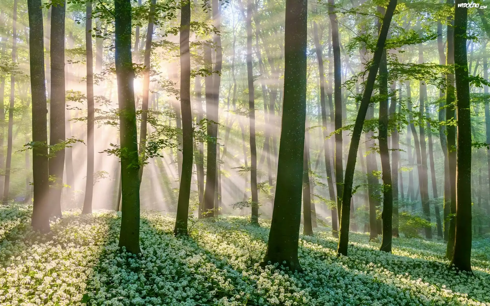 Zdjęcia, Las, Drzewa, Promienie słońca, Czosnek niedźwiedzi