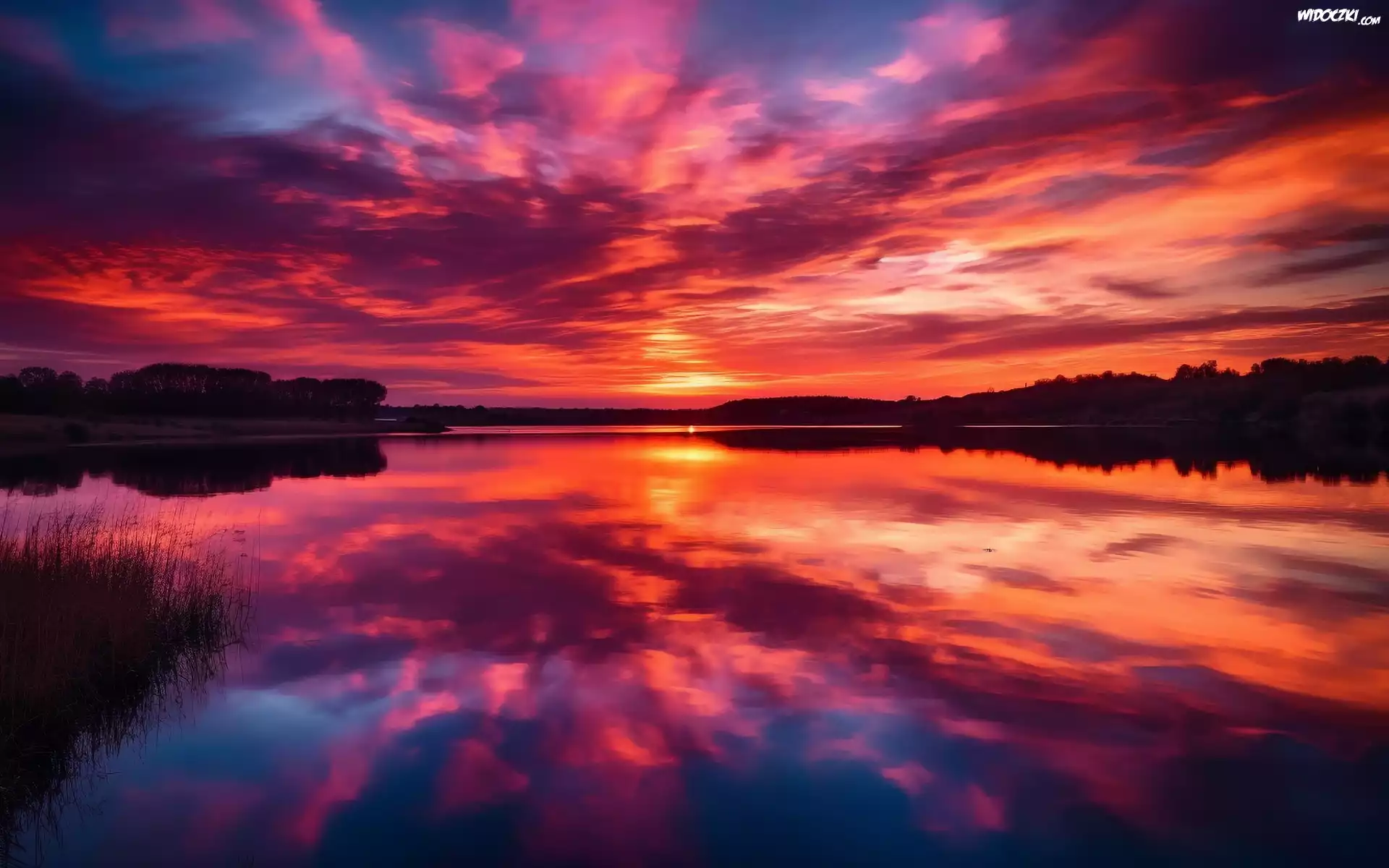 Jezioro, Niebo, Odbicie, Drzewa, Szuwary, Kolorowy, Zachód słońca
