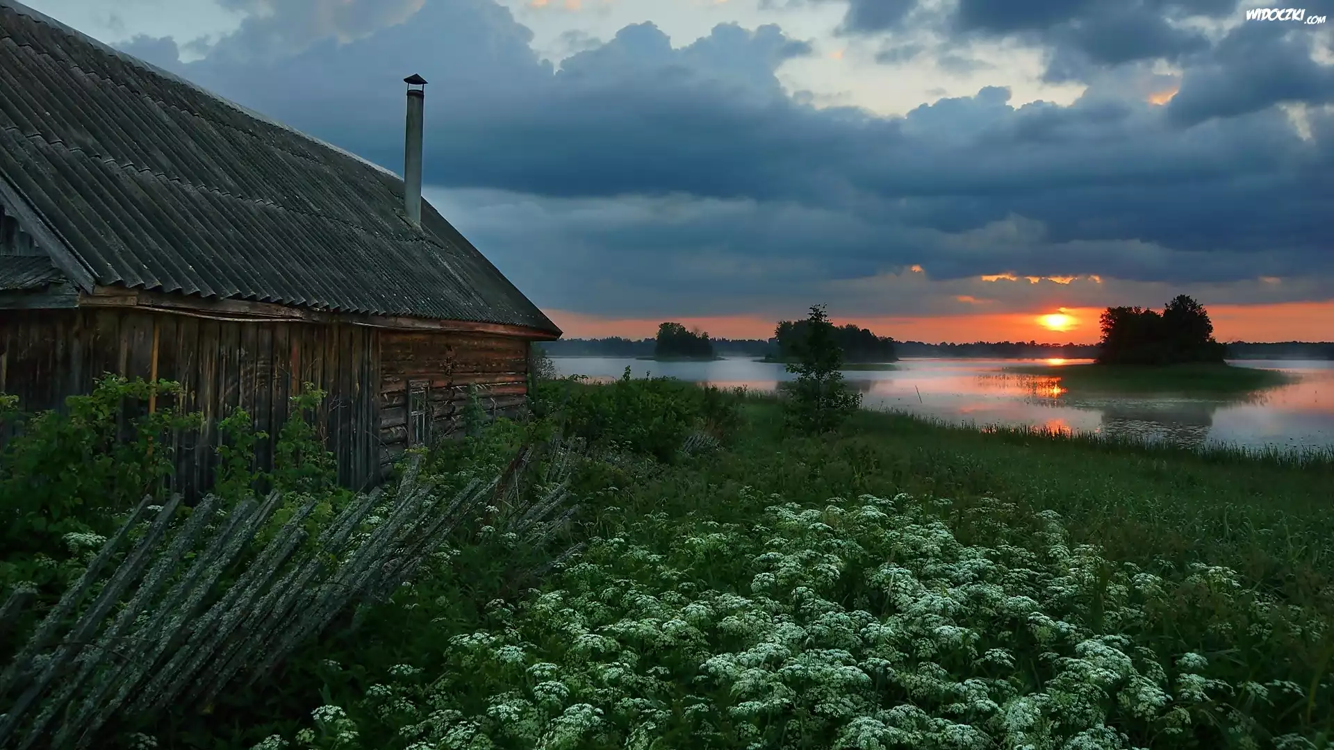 Rosja, Jezioro Ordosno, Wysepki, Drewniany, Dom, Kwiaty, Zachód słońca