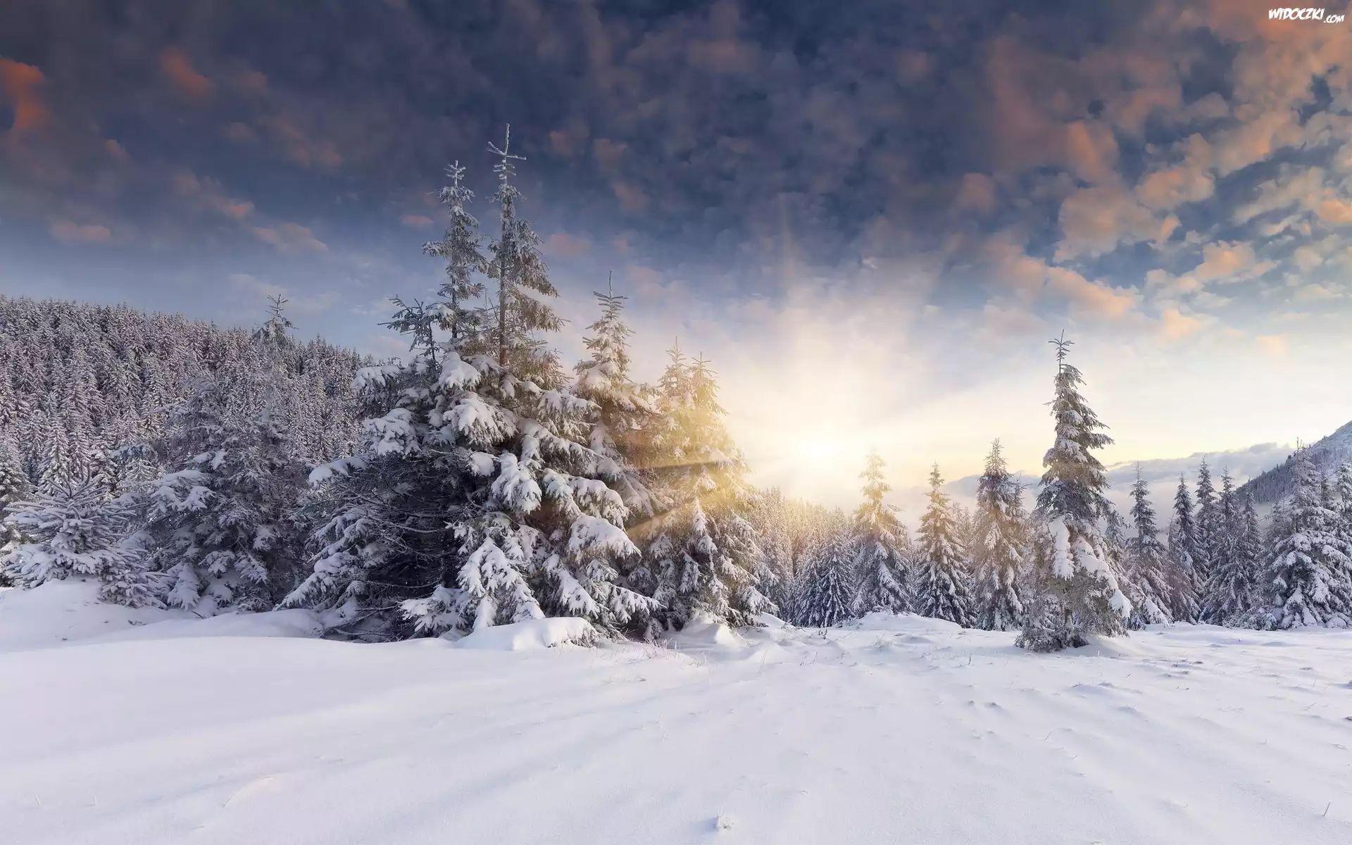 Zima, Las, Ośnieżone, Świerki, Promienie słońca, Chmury Promienie słońca