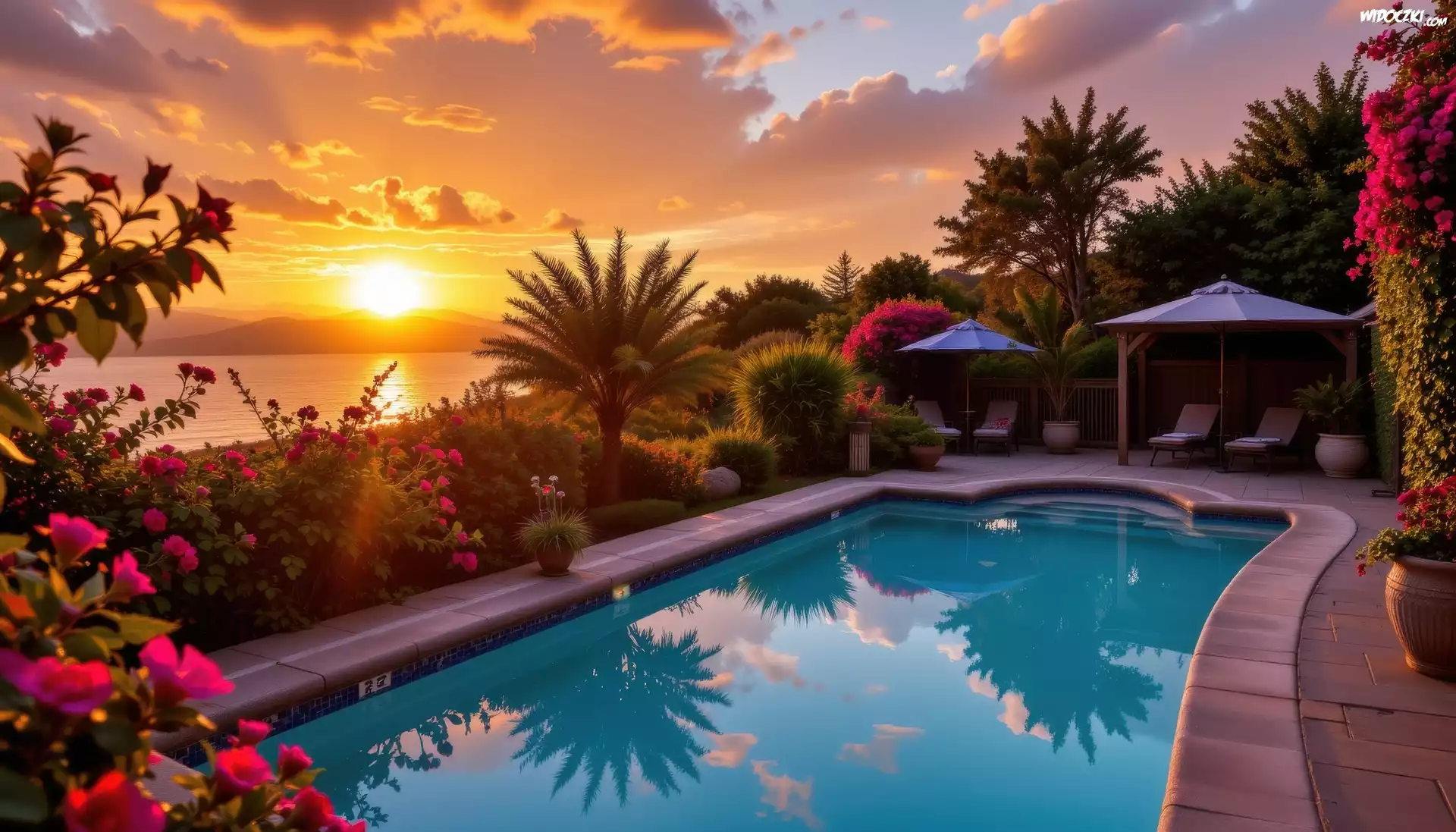 Zdjęcia, Basen, Leżaki, Palmy, Parasole, Morze, Chmury, Zachód słońca