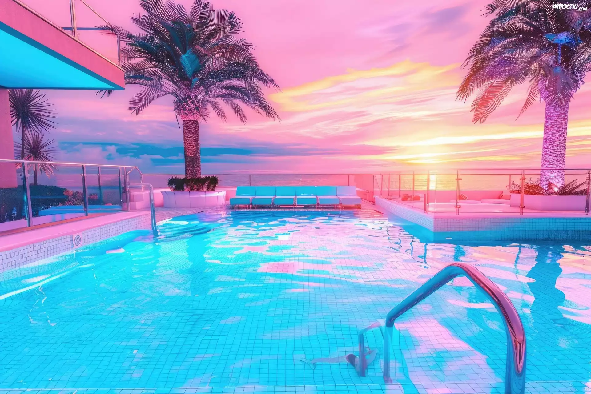 Zdjęcia, Palmy, Basen, Zachód słońca