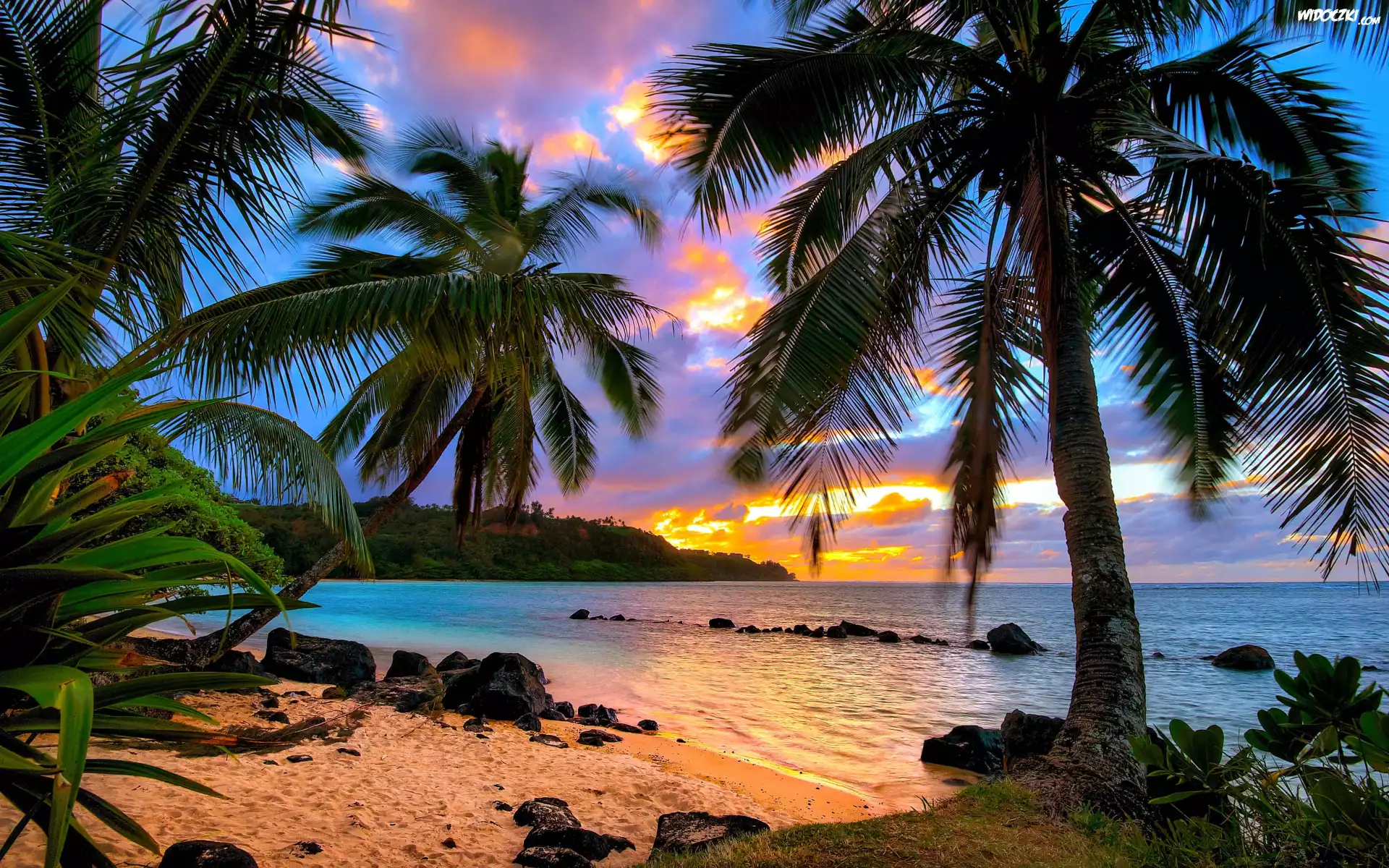Zdjęcia, Morze, Brzeg, Plaża, Palmy, Kamienie, Chmury, Zachód słońca