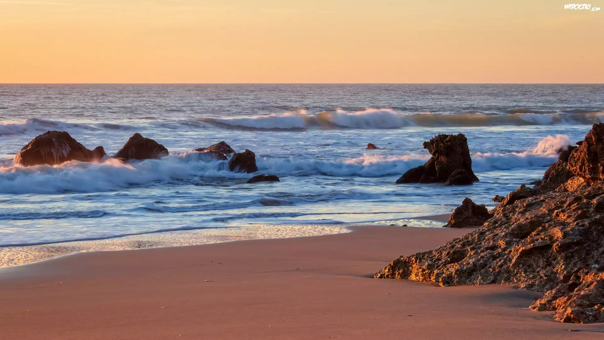 Zdjęcia, Zachód Słońca, Kamienie, Skała, Niebo, Piasek, Morze, Plaża