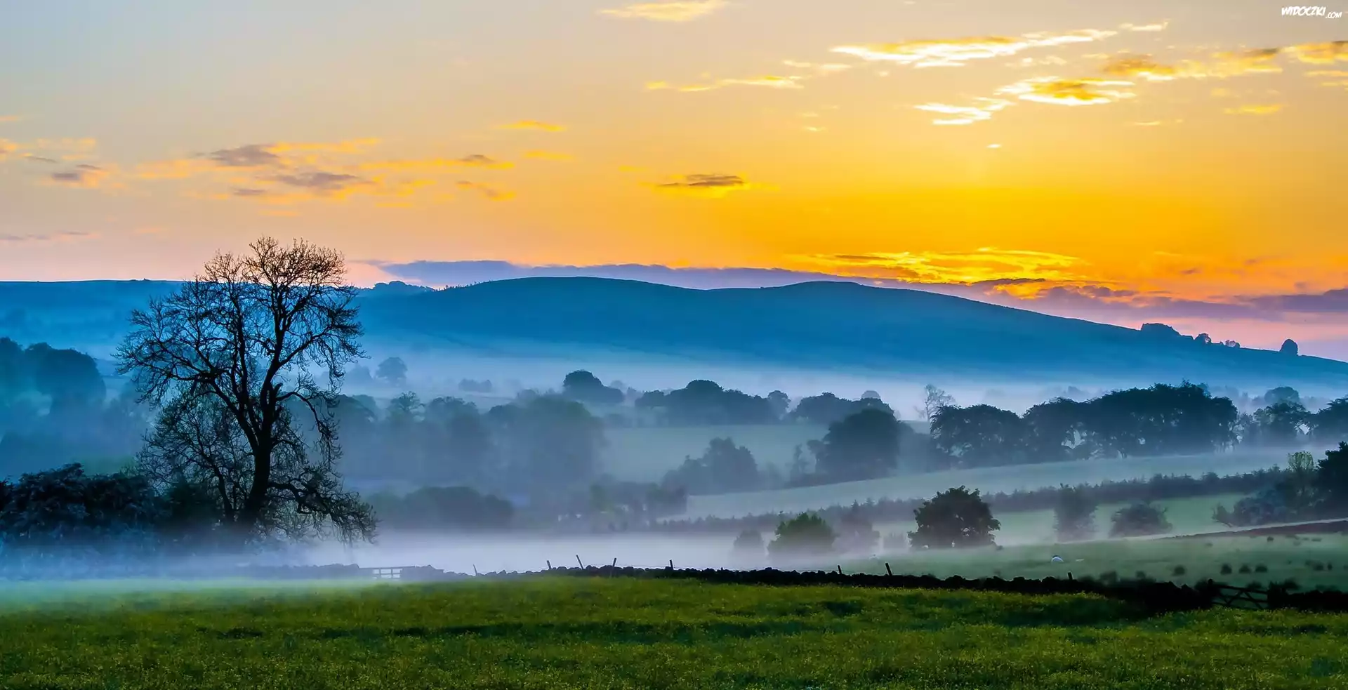 Łąki, Pola, Drzewa, Góry, Wzgórza, Mgła, Wschód, Słońca