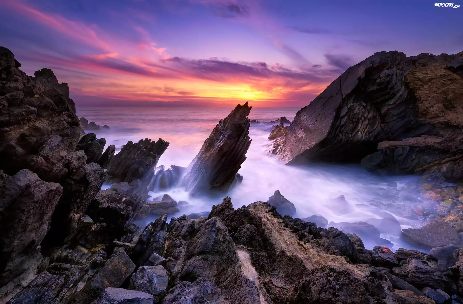 Zdjęcia, Portugalia, Alcabideche, Praia da Grota, Morze, Skały, Zachód Słońca