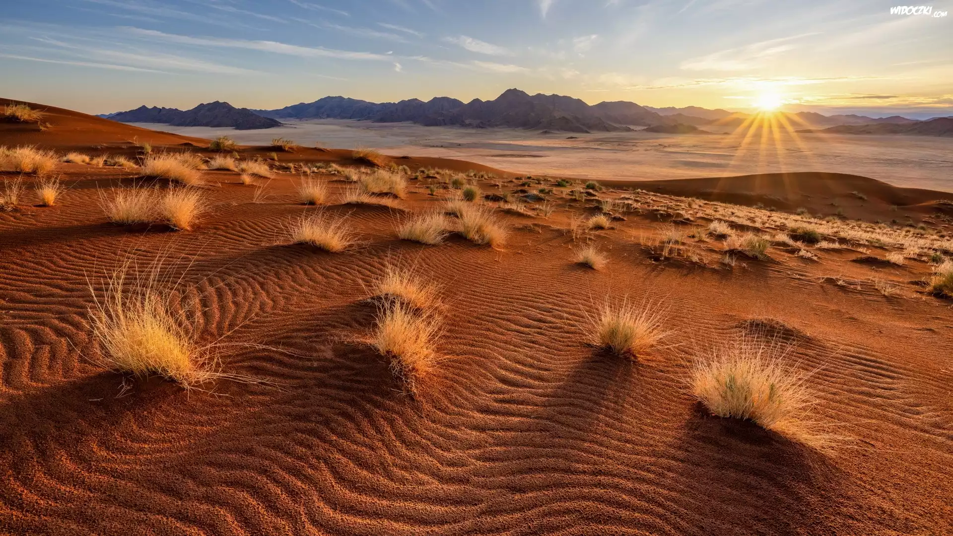 Zdjęcia, Afryka, Namibia, Pustynia Namib, Wydmy, Trawy, Promienie słońca