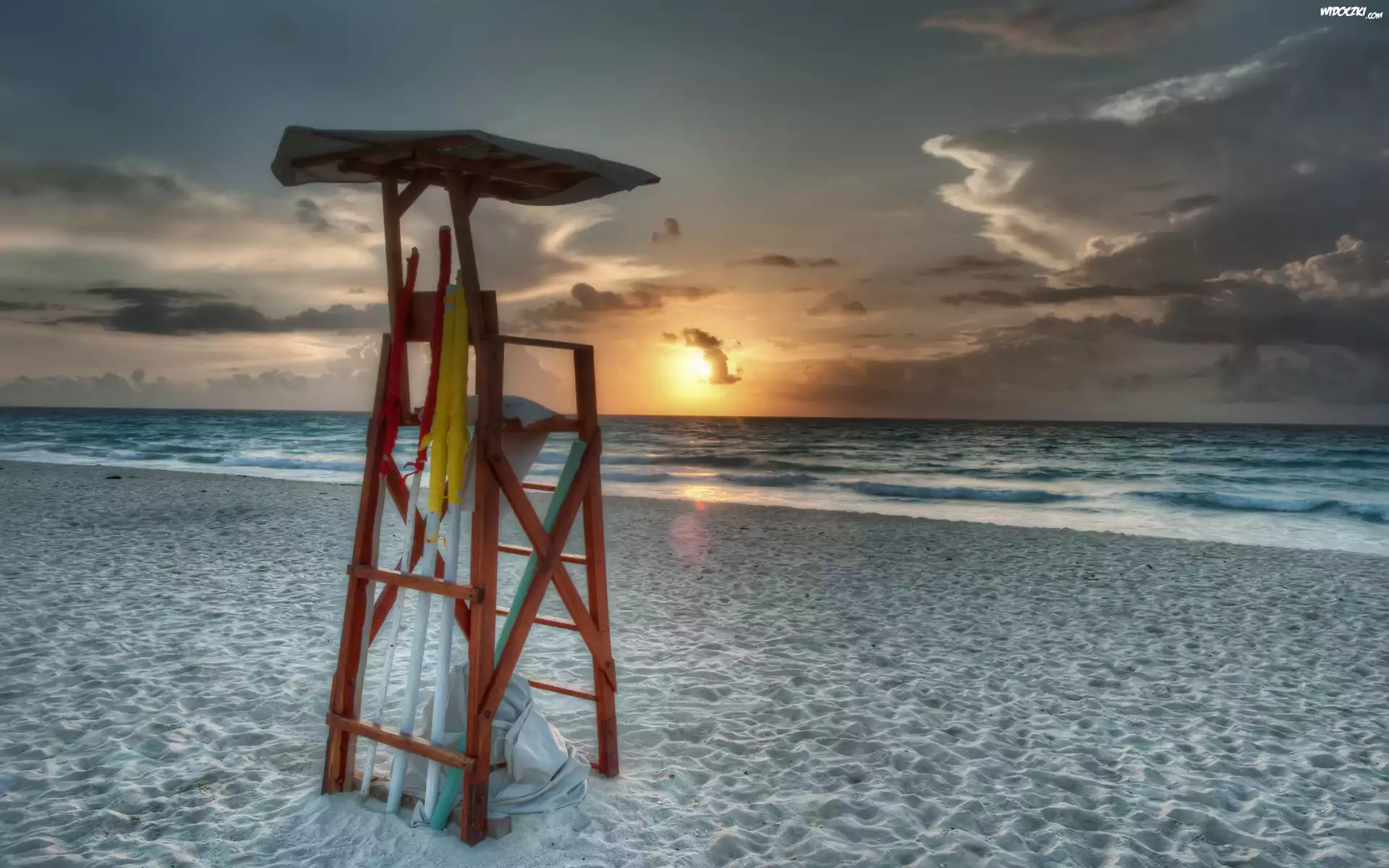 Meksyk, Cancún, Krzesło, Ratownika, Plaża, Morze Karaibskie, Zachód słońca