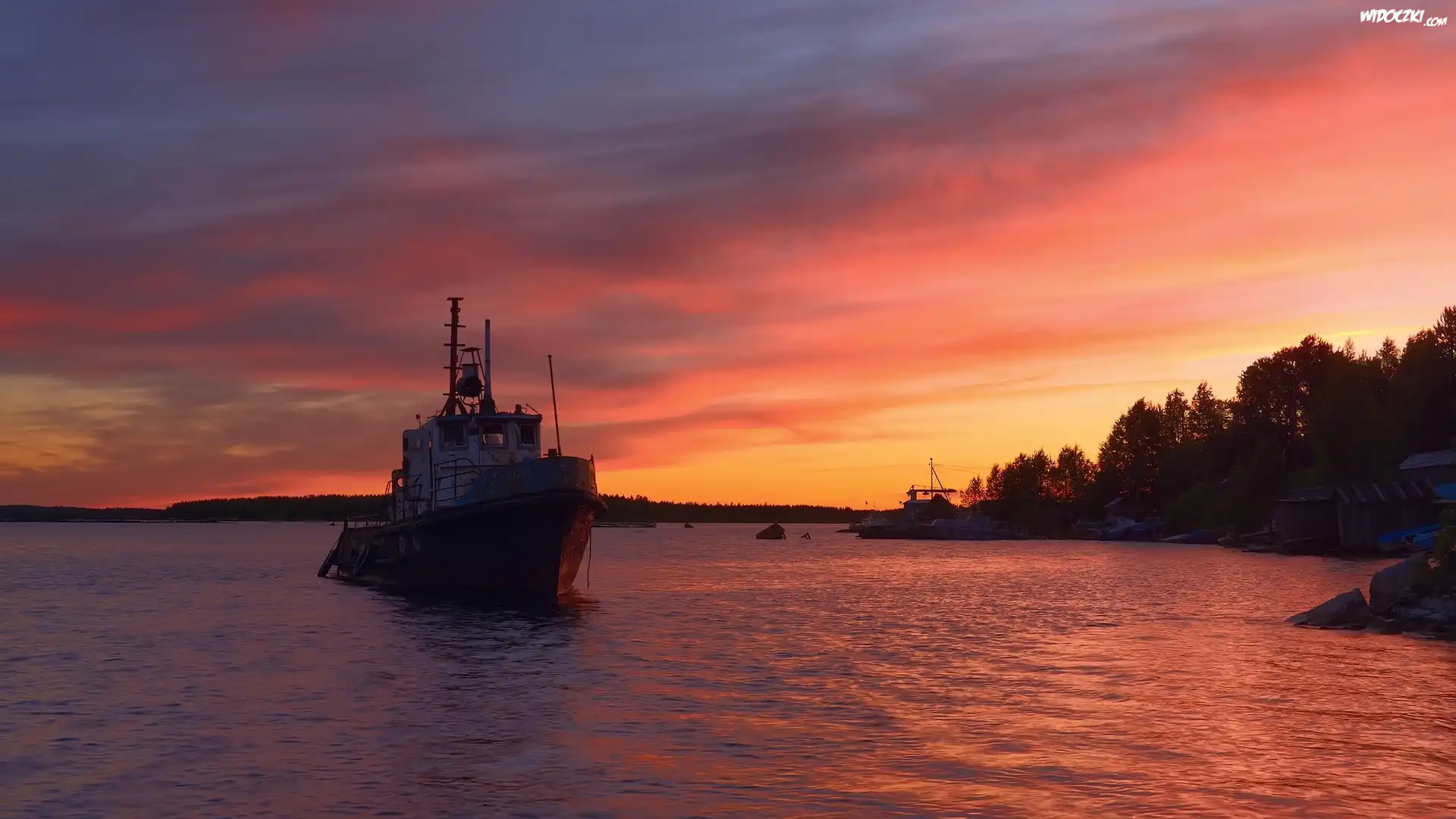 Zdjęcia, Zachód słońca, Kuter rybacki, Jezioro, Siegoziero, Karelia, Rosja