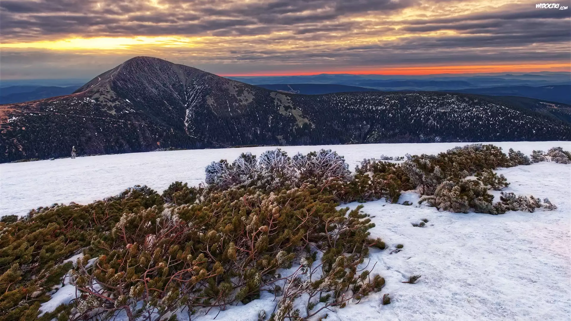 Zdjęcia, Wschód słońca, Góry, Karkonosze, Góra Śnieżka, Ośnieżone, Rośliny, Śnieg, Zima
