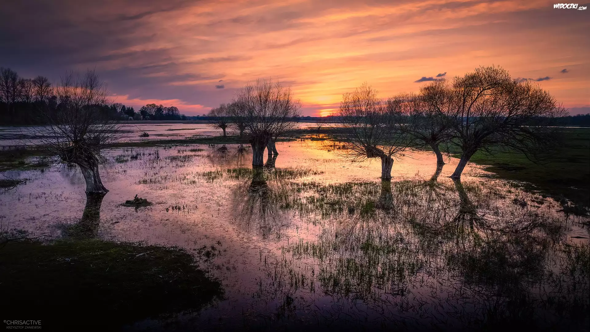 Zdjęcia, Rozlewisko, Drzewa, Zachód słońca