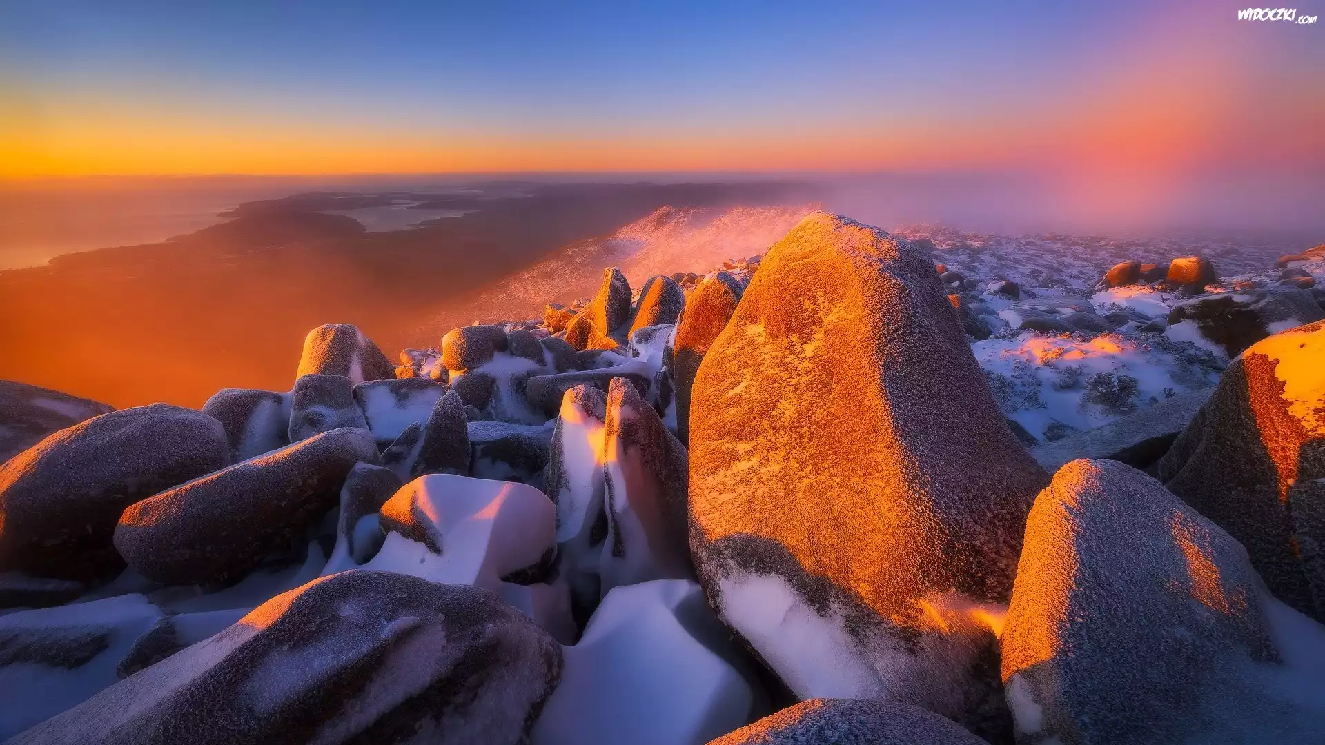 Zachód słońca, Rozświetlone, Ośnieżone, Kamienie