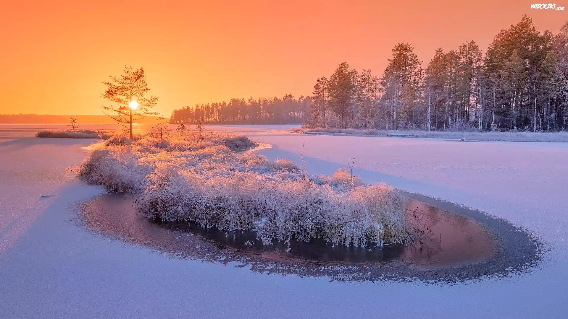 Zdjęcia, Zima, Drzewa, Rzeka, Siegieża, Karelia, Rosja, Wschód słońca