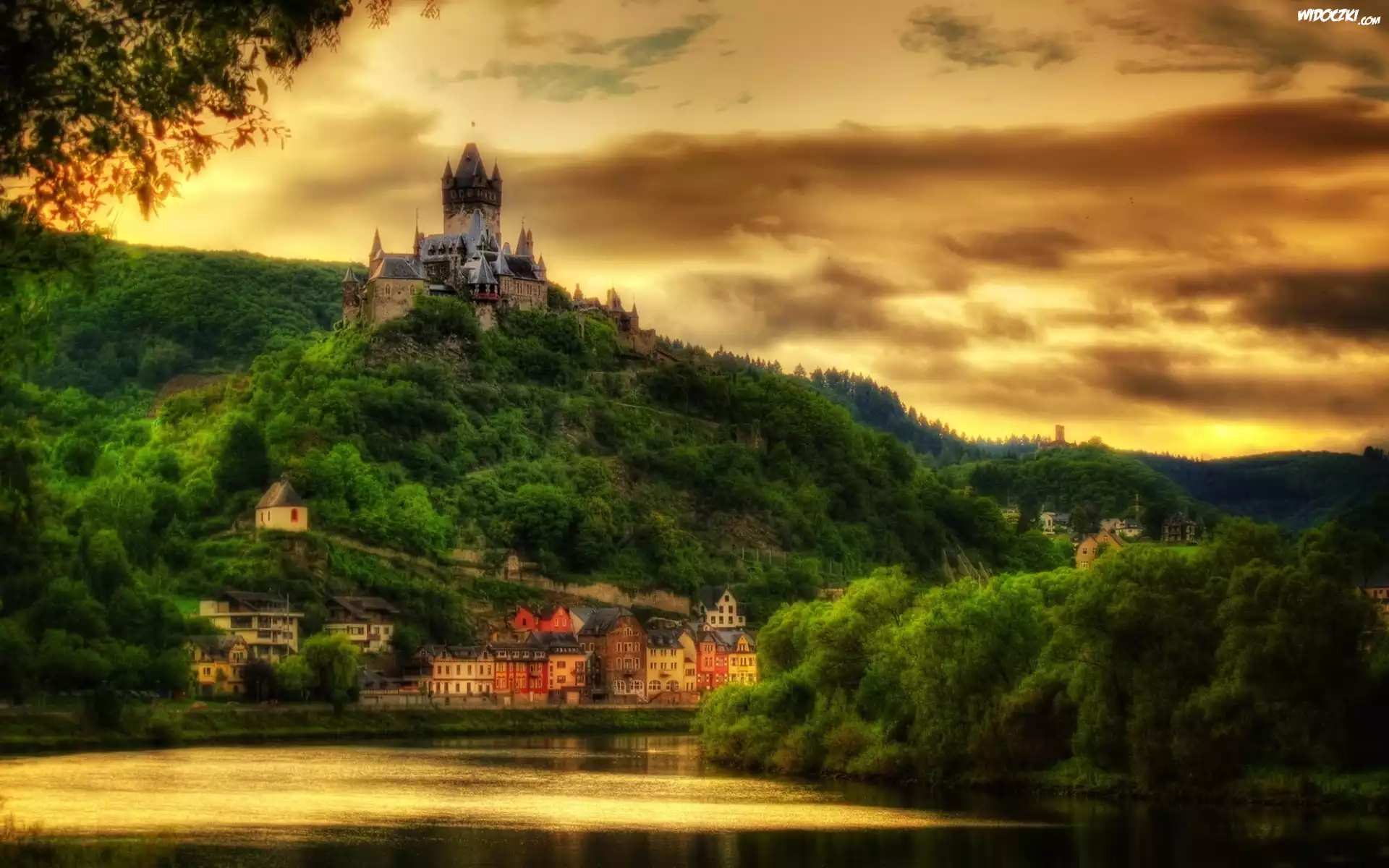 Zdjęcia, Zamek Reichsburg, Gmina Cochem, Rzeka Mozella, Niemcy, Wzgórze, Zachód słońca