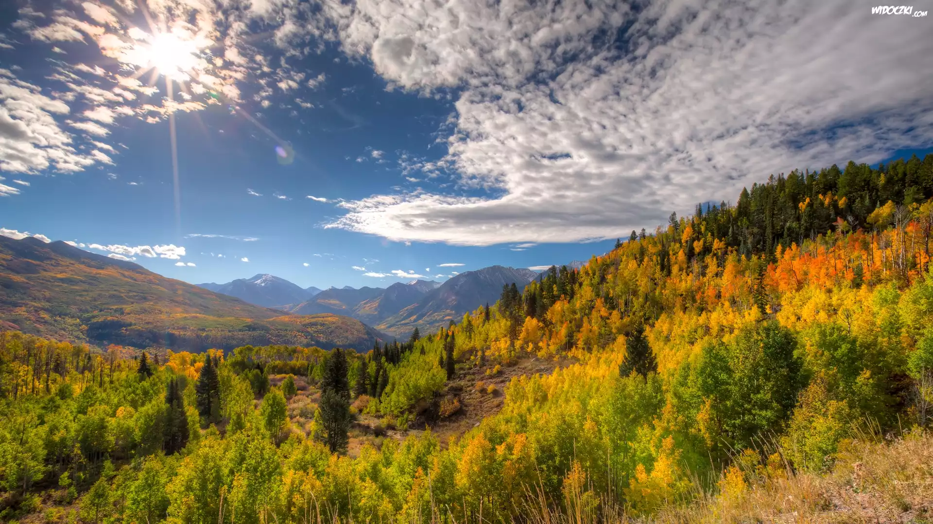 Zdjęcia, Stany Zjednoczone, Kolorado, Góry Skaliste, Jesień, Drzewa, Chmury, Promienie słońca