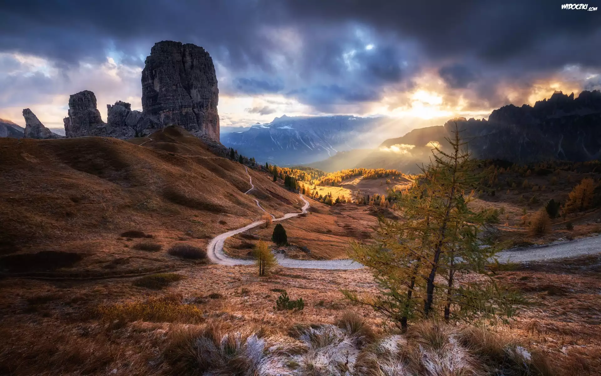 Góry, Dolomity, Skały, Cinque Torri, Las, Drzewa, Jesień, Wschód słońca, Chmury, Włochy