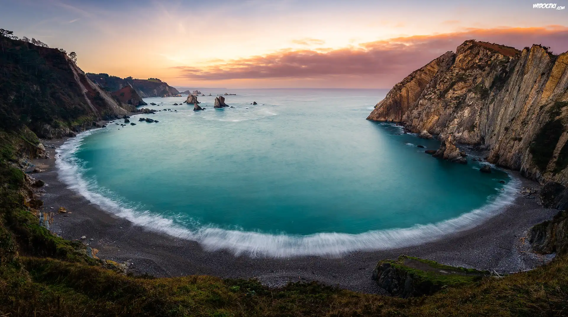 Zdjęcia, Morze, Zachód słońca, Góry, Skały, Plaża, Playa del Silencio, Asturia, Hiszpania