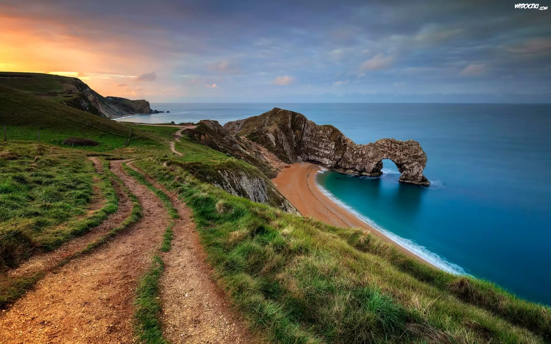 Zdjęcia, Anglia, Morze, Wybrzeże Jurajskie, Skały, Durdle Door, Droga, Zachód słońca