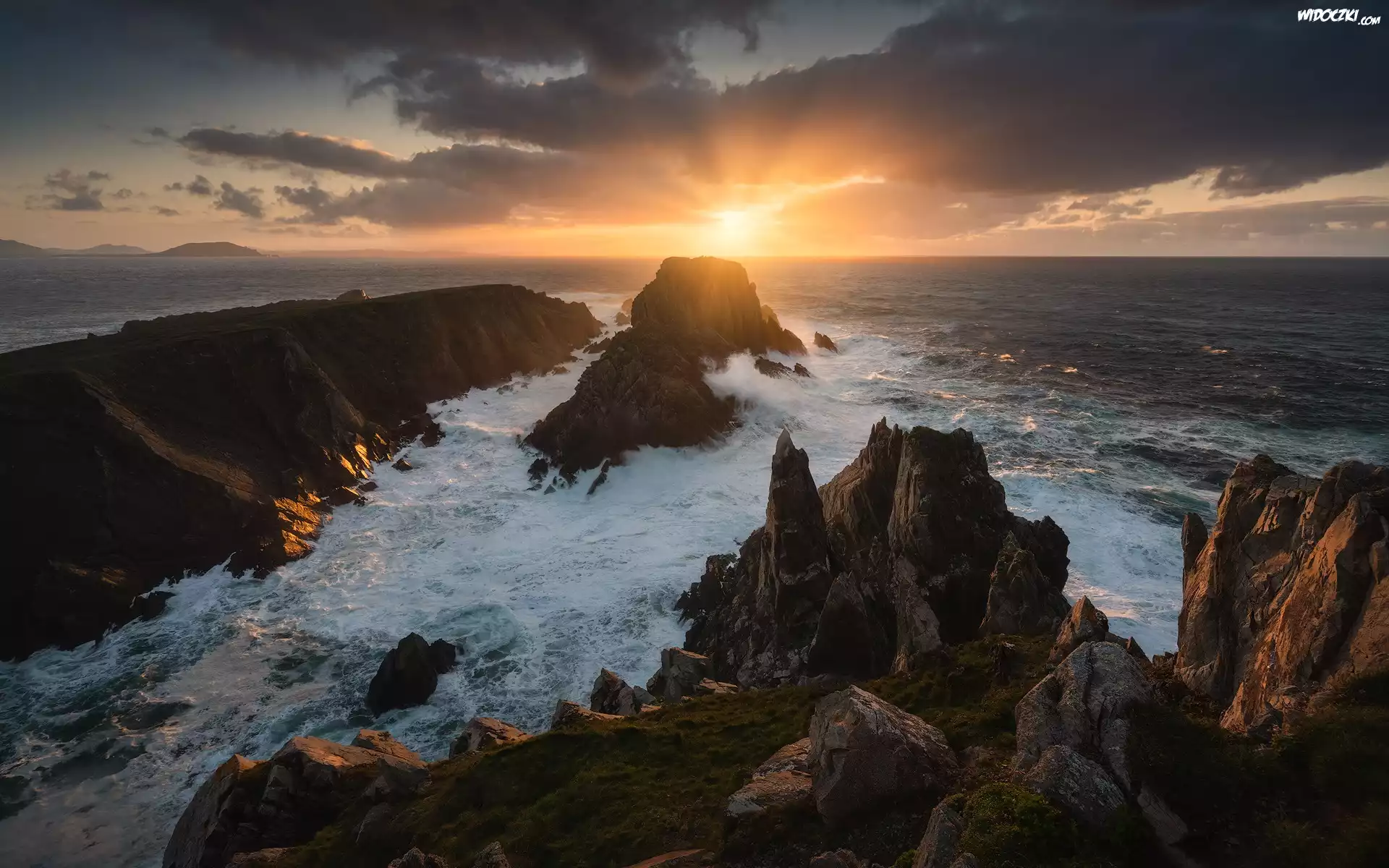 Morze, Fale, Zachód słońca, Chmury, Skały
