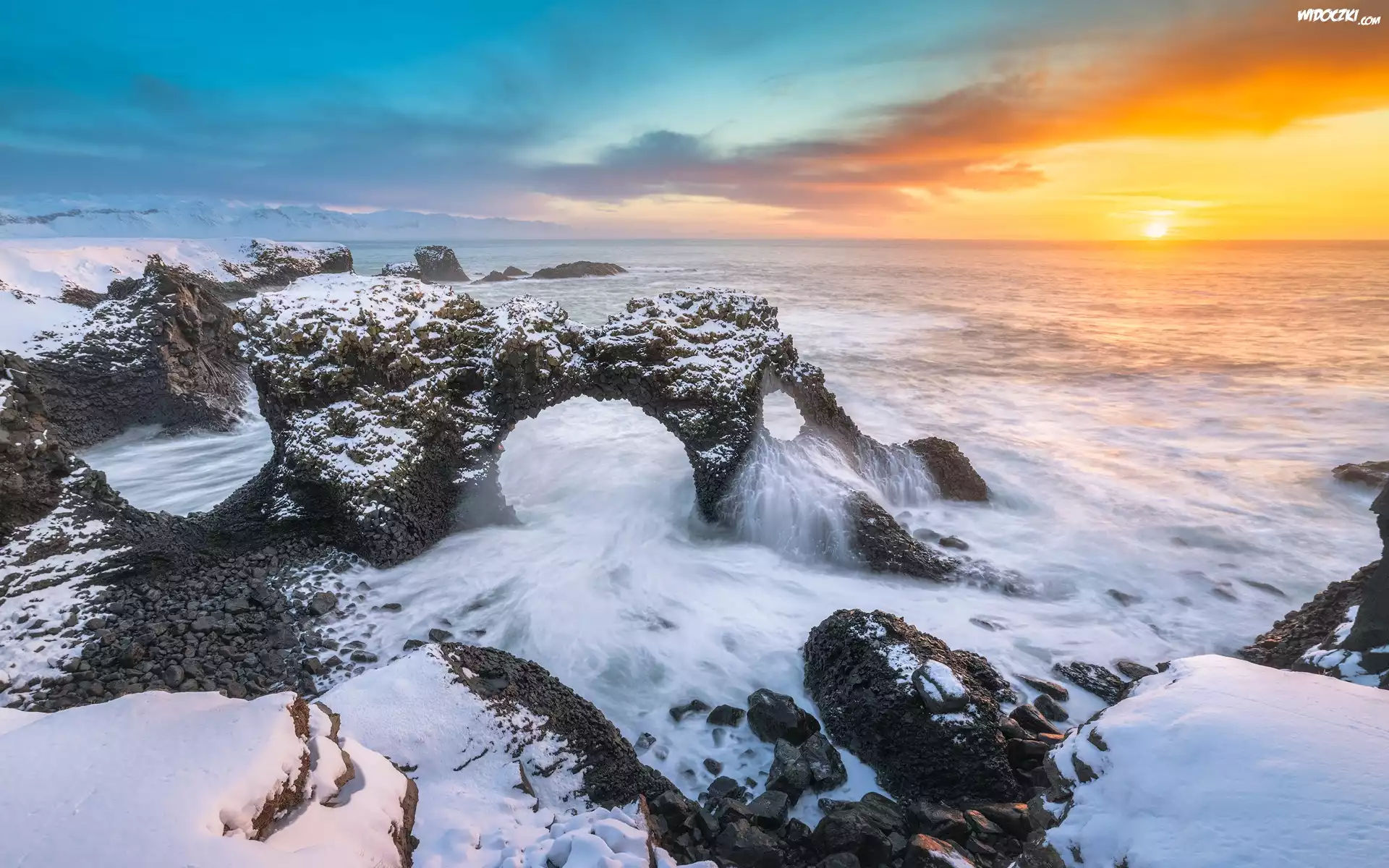 Zima, Morze, Zachód słońca, Wybrzeże, Skały