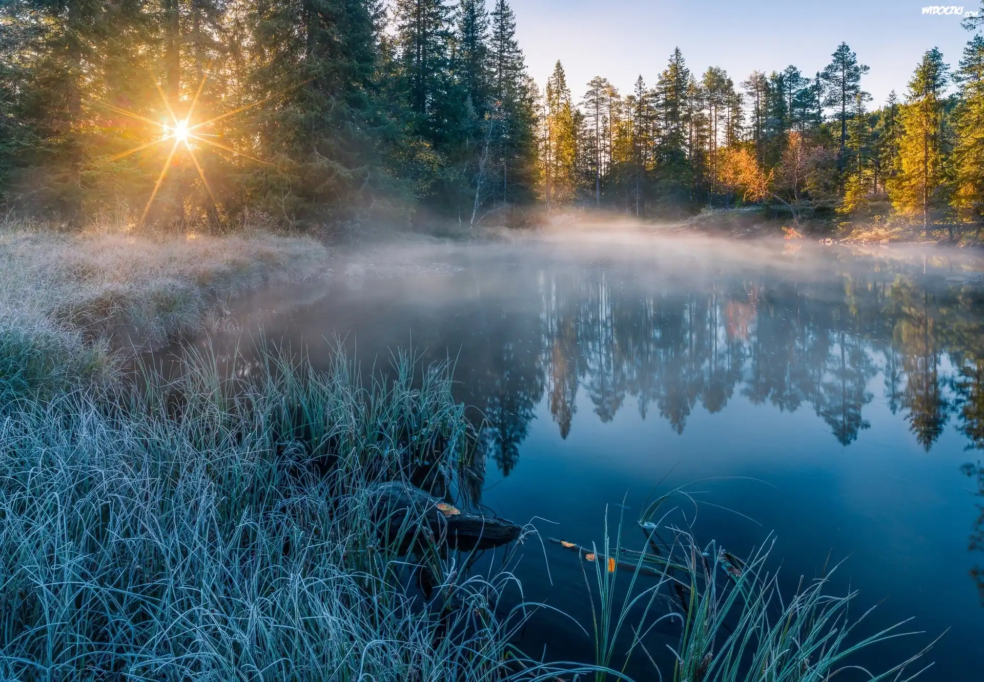 Wschód Słońca, Mróz, Rzeka, Mgła, Drzewa, Promienie słońca