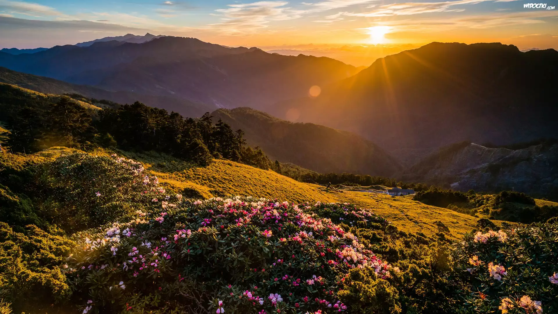 Zdjęcia, Zachód słońca, Góry, Kwiaty, Różaneczniki, Dolina, Promienie słońca