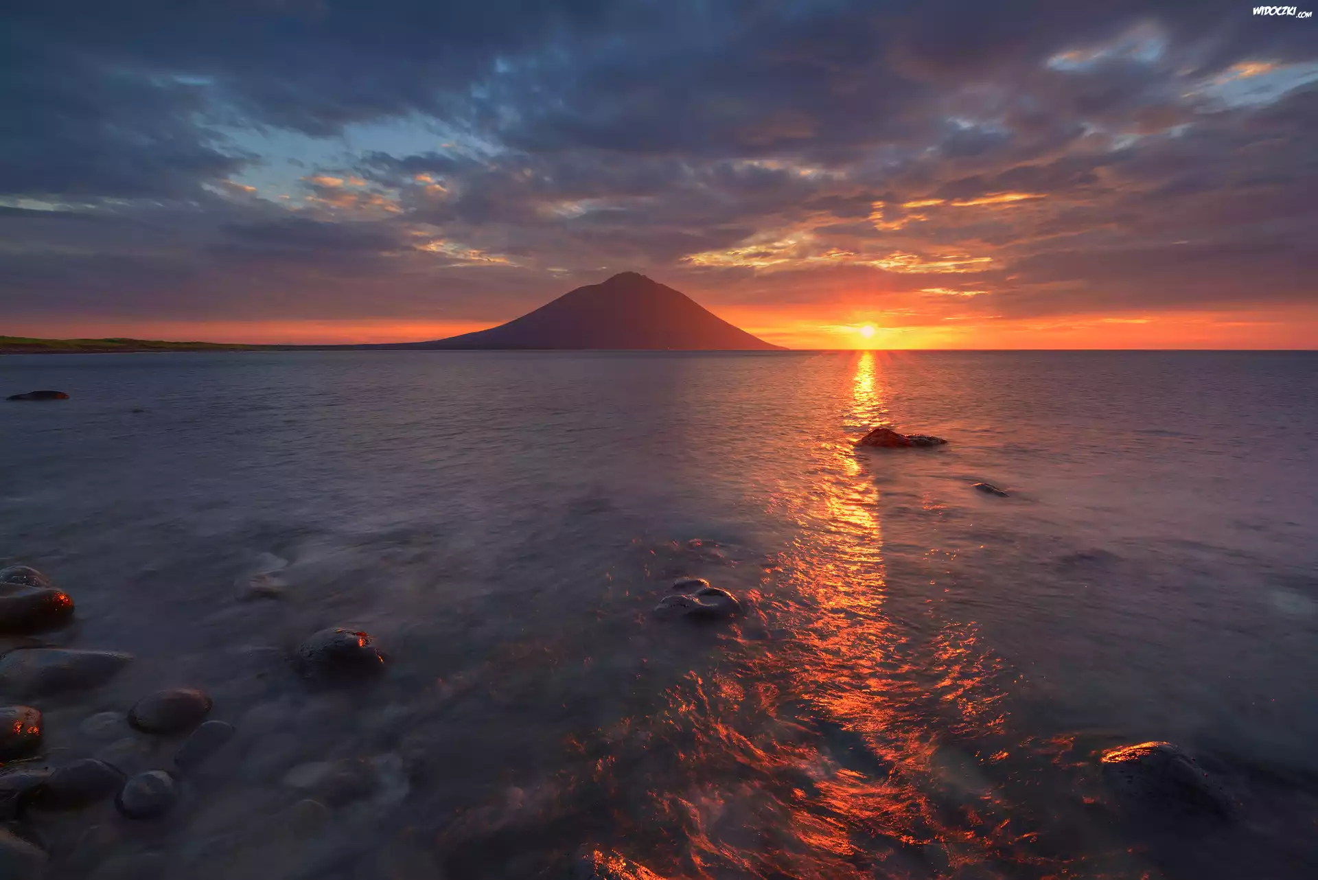 Startowulkan Atsonupuri, Góra, Zachód słońca, Morze, Kamienie, Wyspy Kurylskie, Wyspa Iturup, Obwód sachaliński, Rosja |