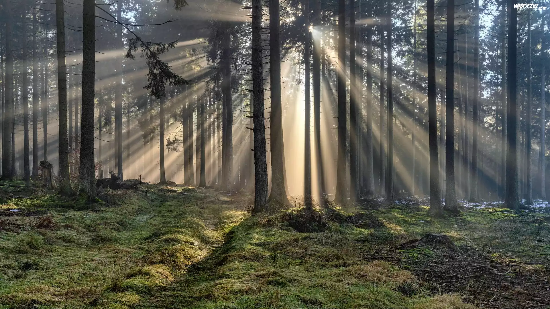 Las, Drzewa, Promienie słońca, Smugi, Światła
