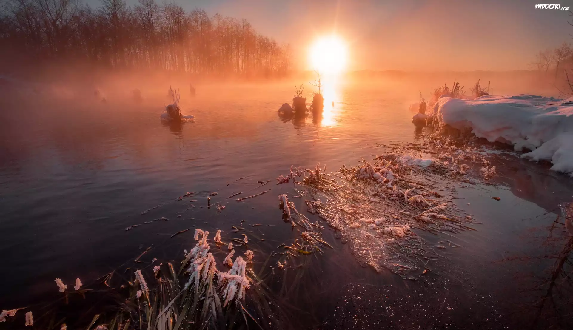 Zima, Zachód słońca, Jezioro Szaturskie, Drzewa, Mgła, Shatura, Obwód moskiewski, Rosja