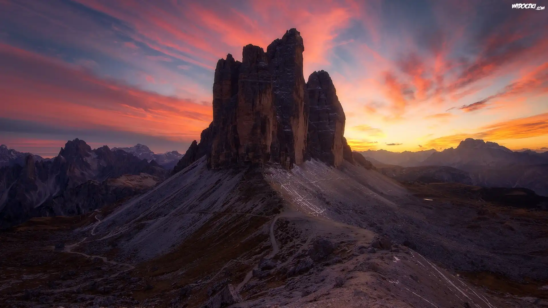 Zdjęcia, Włochy, Dolomity, Góry, Masyw, Tre Cime di Lavaredo, Zachód słońca