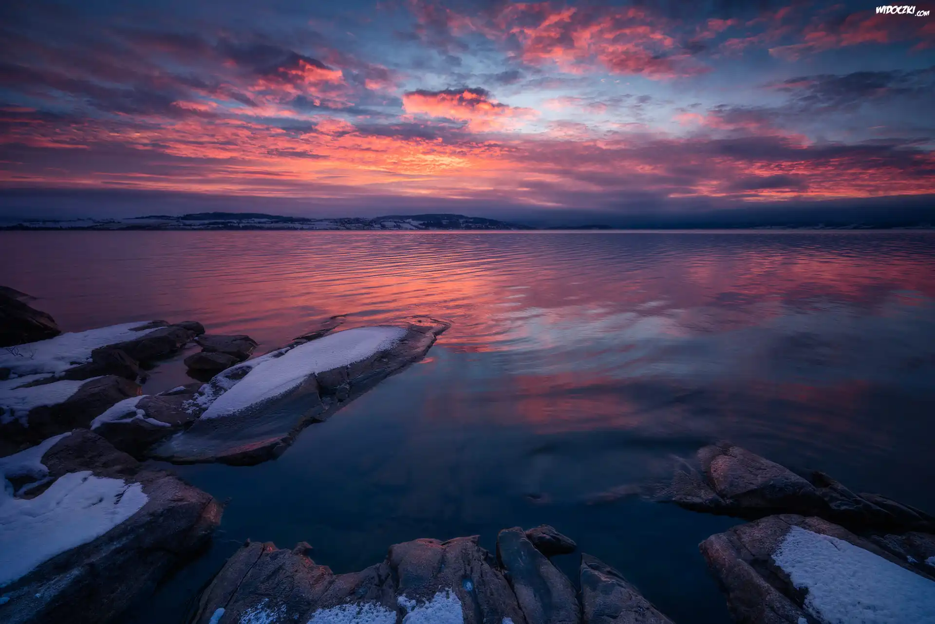 Norwegia, Jezioro Tyrifjorden, Kamienie, Zima, Śnieg, Chmury, Wschód słońca