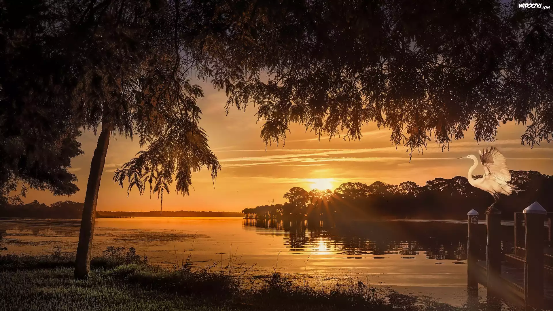 Zdjęcia, Drzewa, Jezioro, Wieczór, Pomost, Ptak, Chmury, Zachód słońca