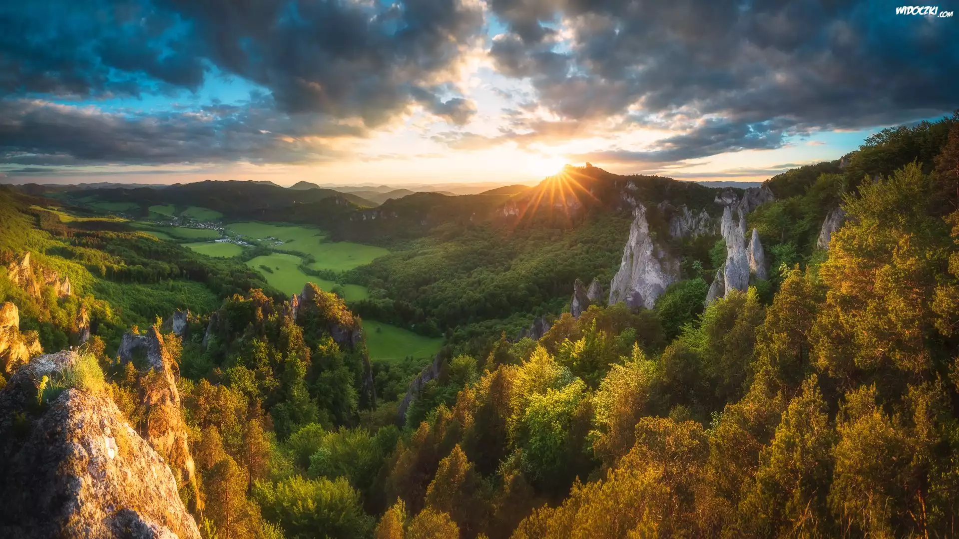 Zdjęcia, Góry, Sulowskie Wierchy, Skały, Dolina, Domy, Las, Drzewa, Promienie słońca, Chmury, Słowacja