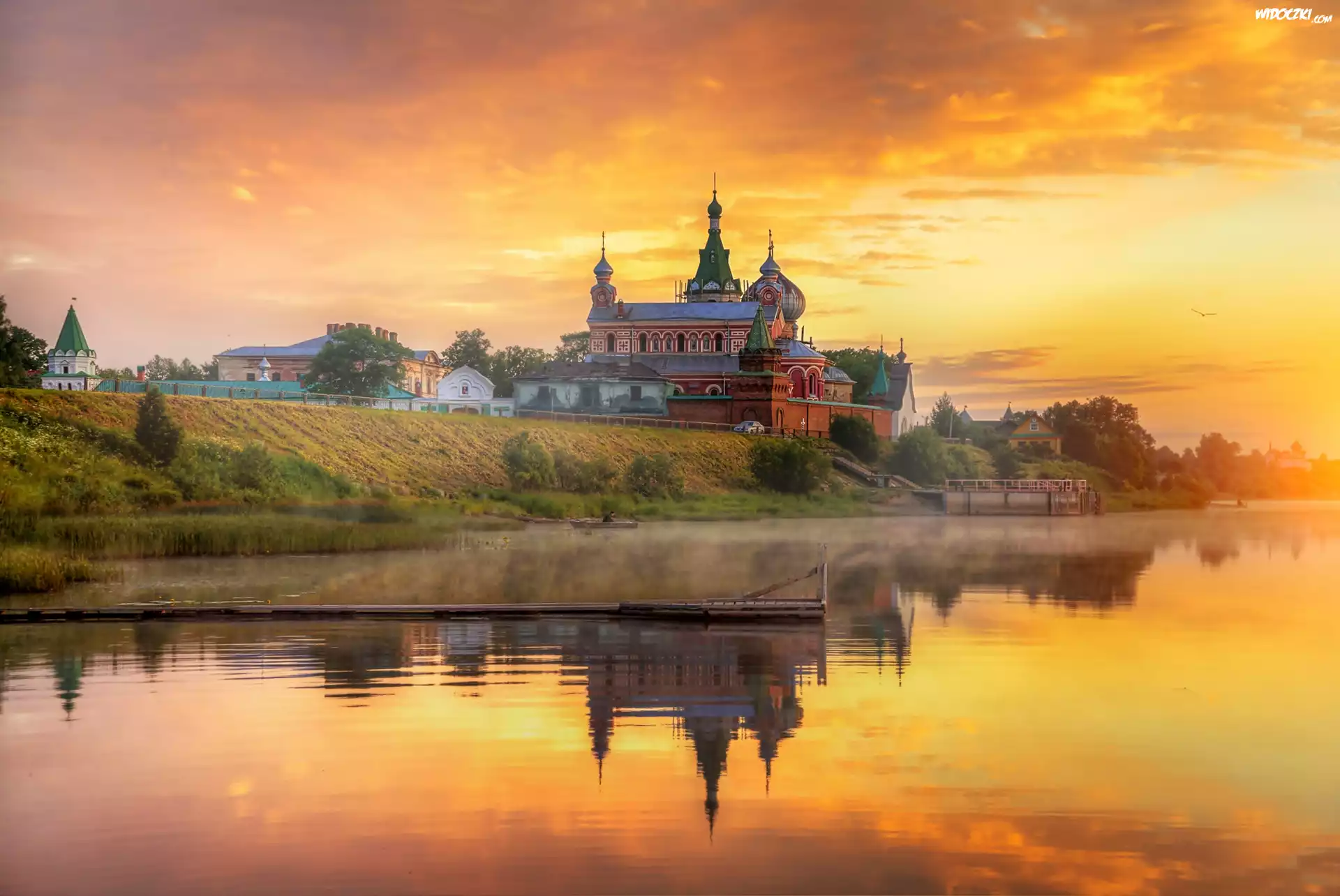 Rosja, Cerkiew, Rzeka Wołchow, Wieś Stara Ładoga, Mgła, Zachód słońca