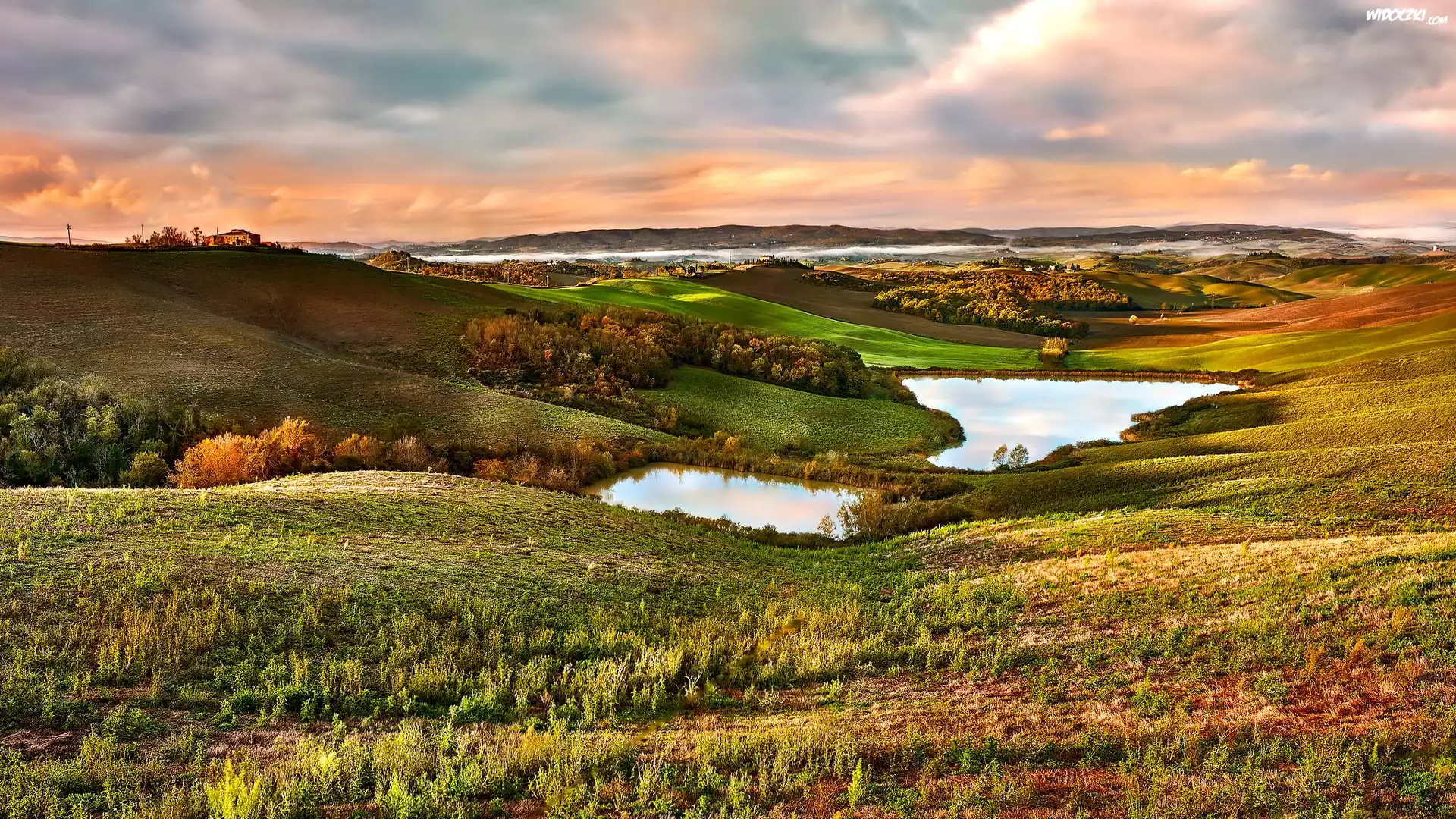 Zdjęcia, Zachód słońca, Wzgórza, Jeziora, Roślinność, Mucigliani, Toskania, Włochy