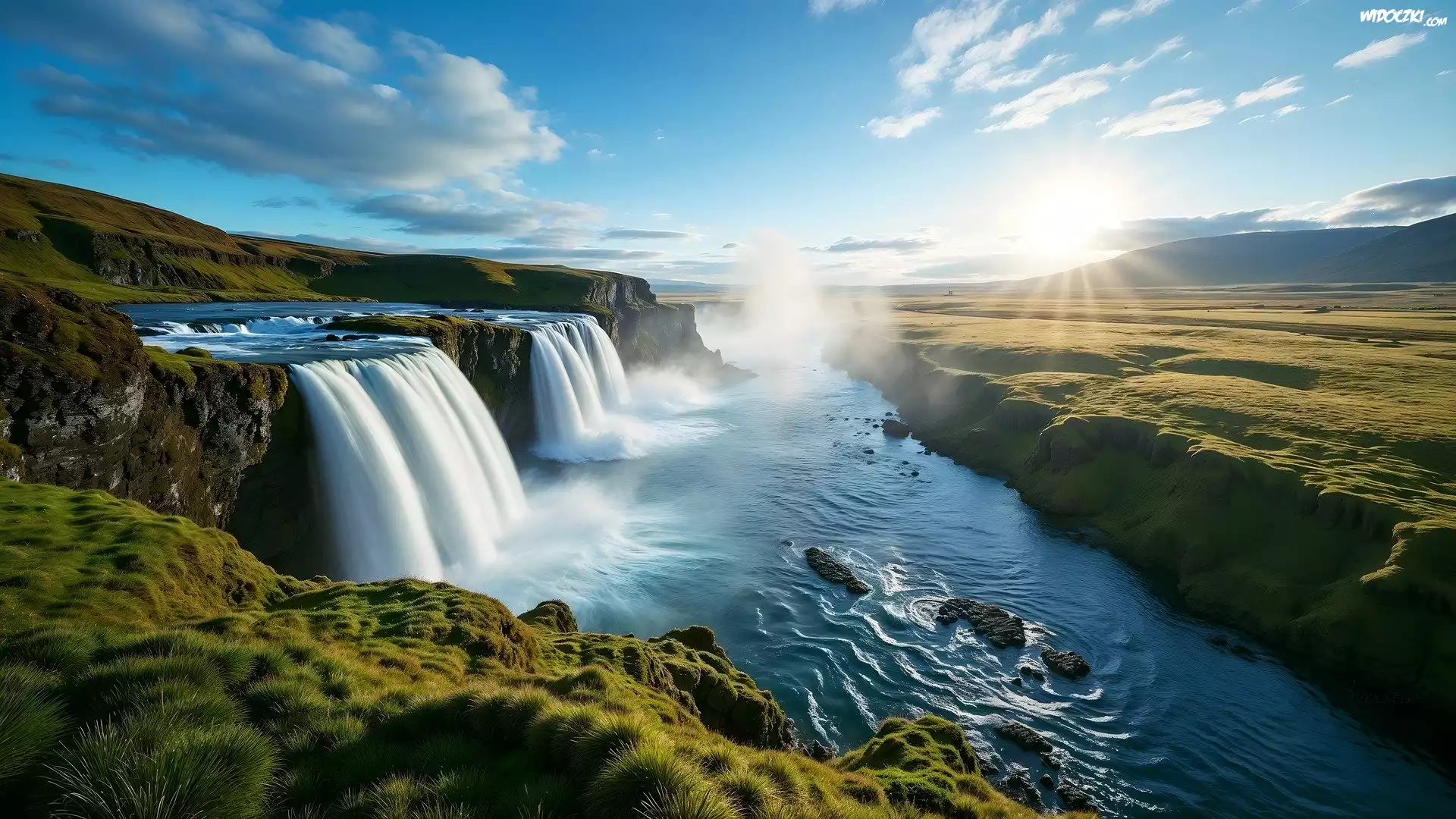 Zdjęcia, Wodospad, Rzeka, Promienie słońca
