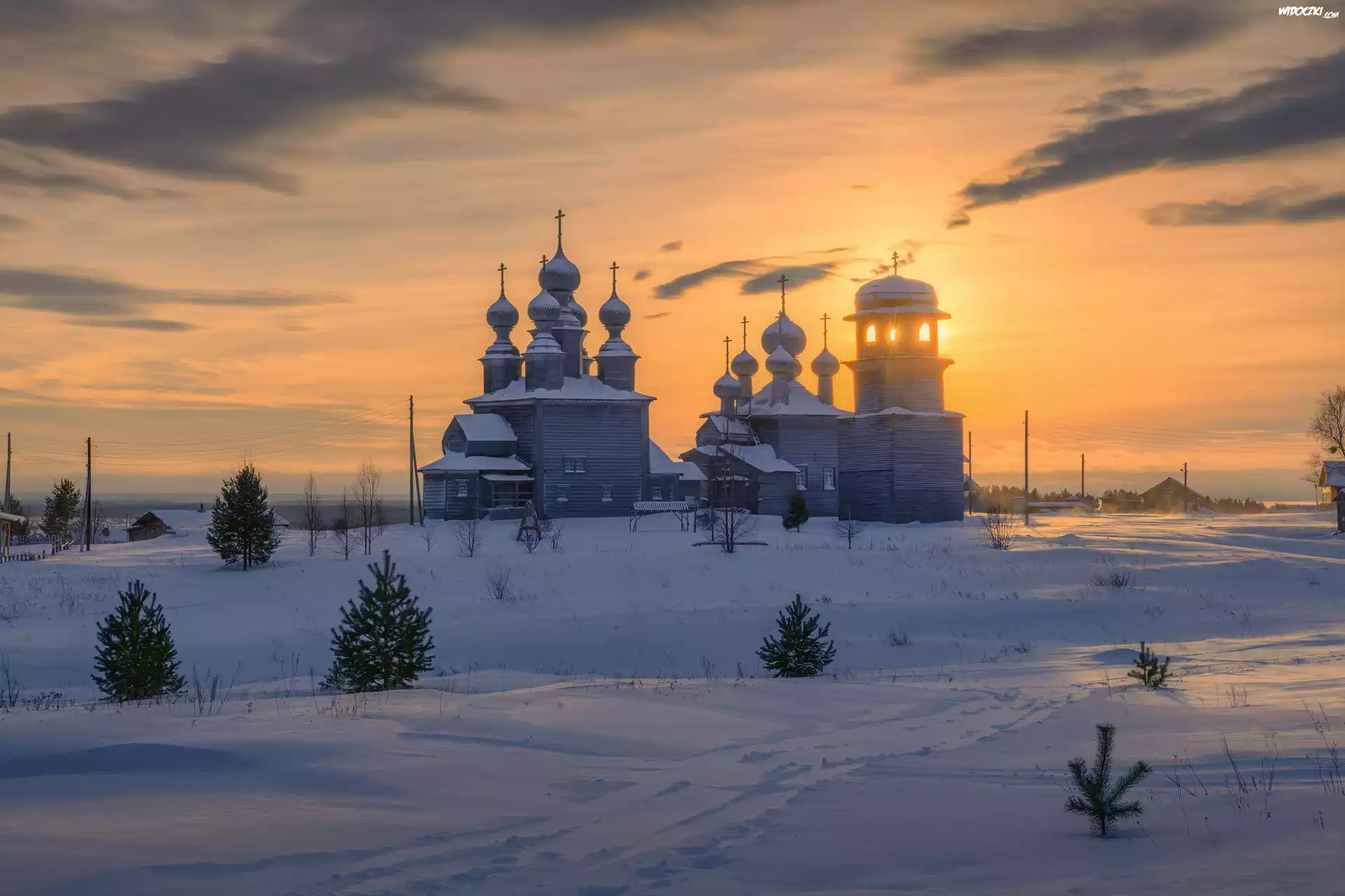 Zima, Śnieg, Cerkwie, Dzwonnica, Drzewa, Wschód słońca, Worzogory, Obwód archangielski, Rosja