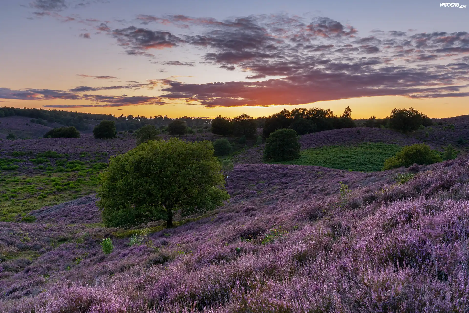 Wrzosowisko, Wrzosy, Drzewa, Chmury, Zachód słońca, Park Narodowy Veluwezoom, Prowincja Geldria, Holandia |