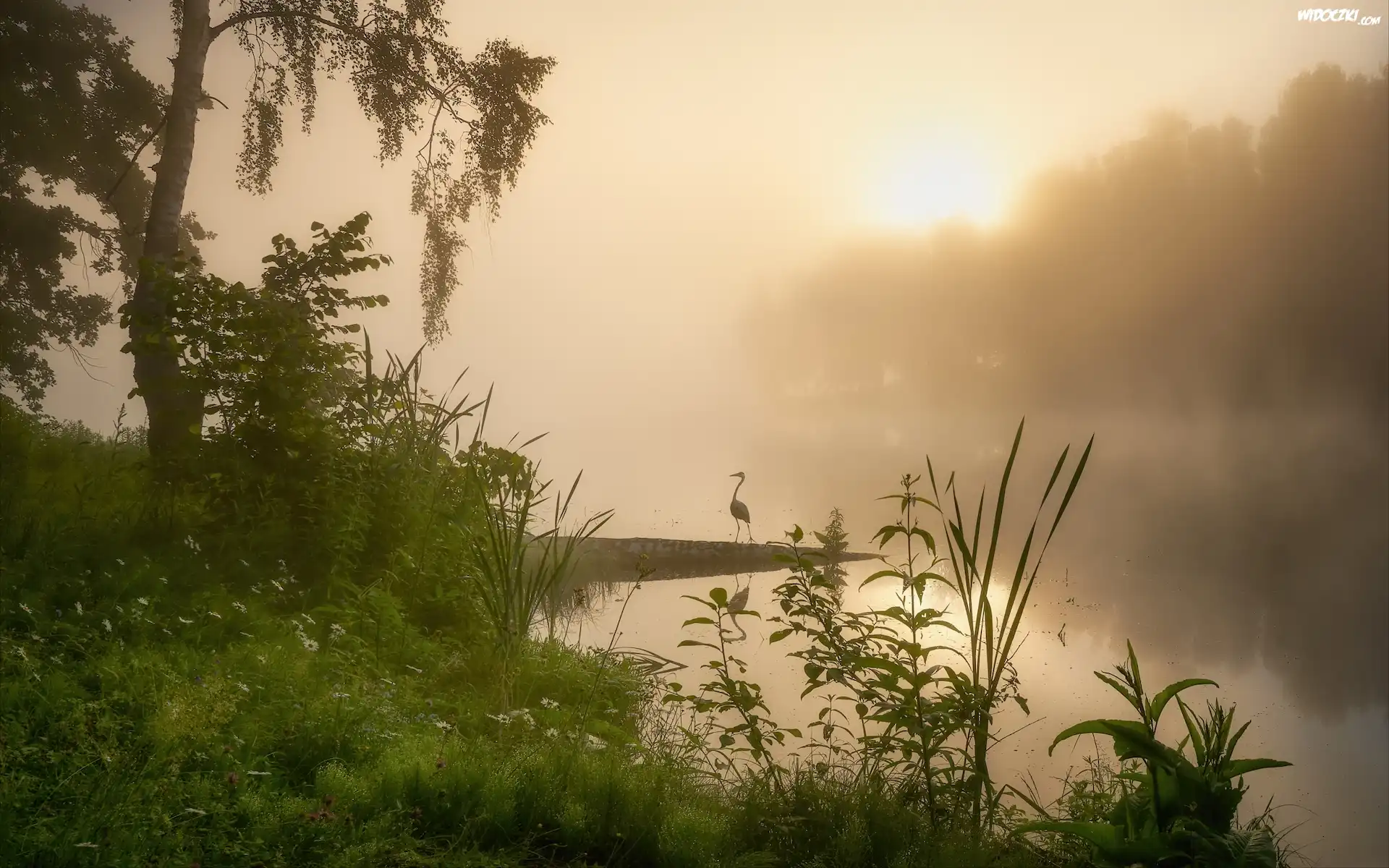 Wschód słońca, Jezioro, Mgła, Drzewo, Roślinność, Czapla