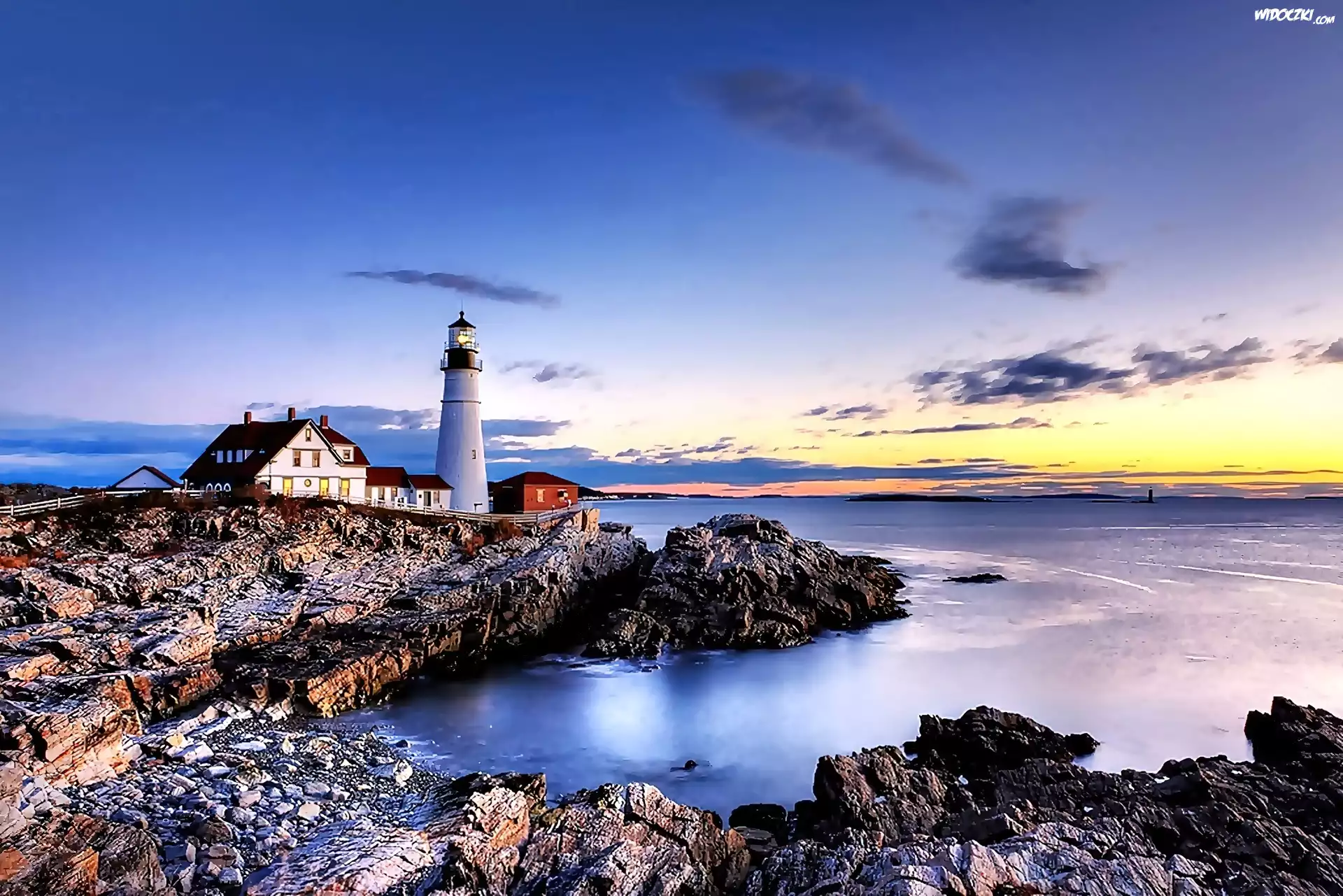 Zdjęcia, Wschód, Słońca, Morze, Skały, Latarnia, Morska, Domy