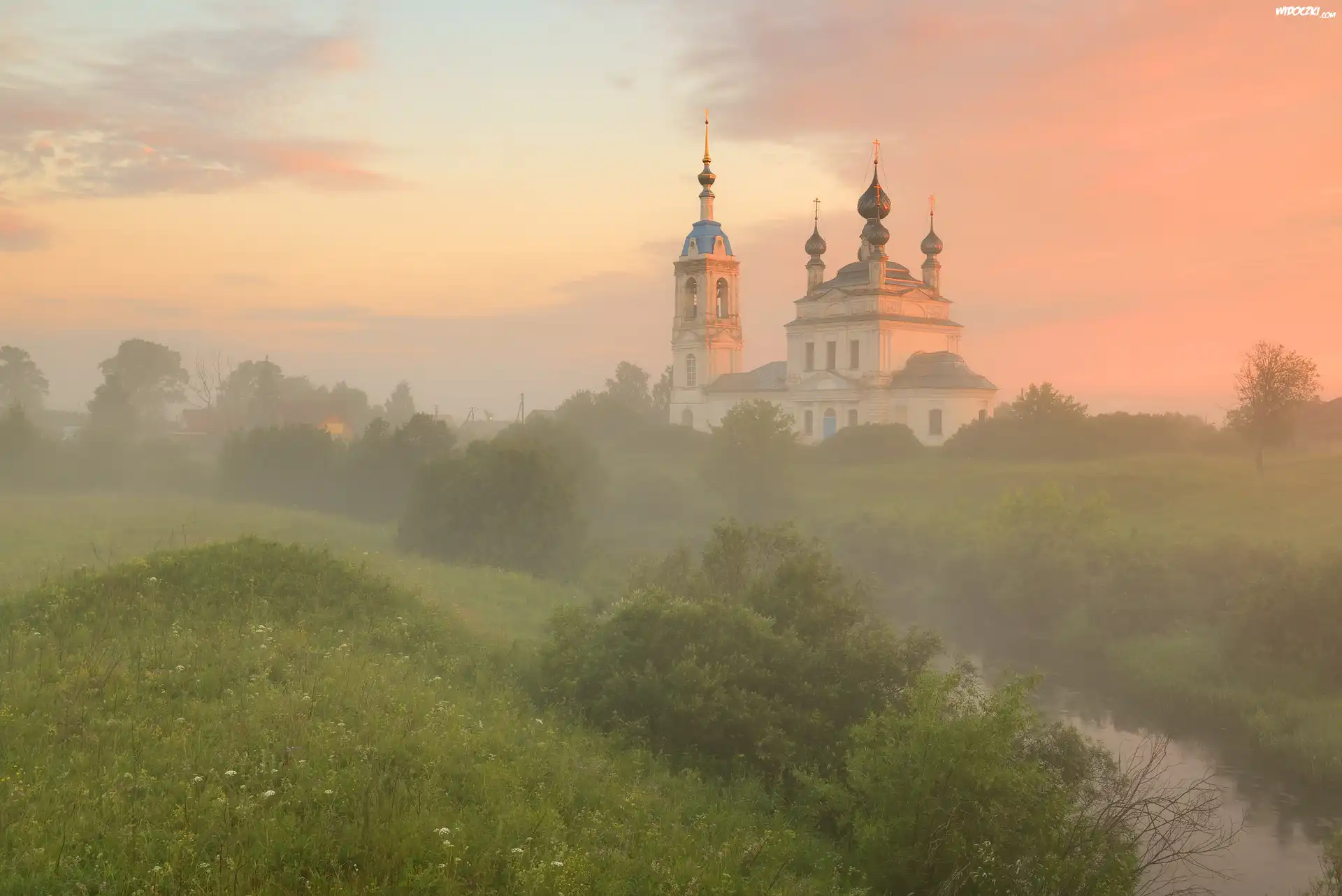 Zdjęcia, Wschód słońca, Cerkiew, Jesień, Mgła, Rzeka, Drzewa