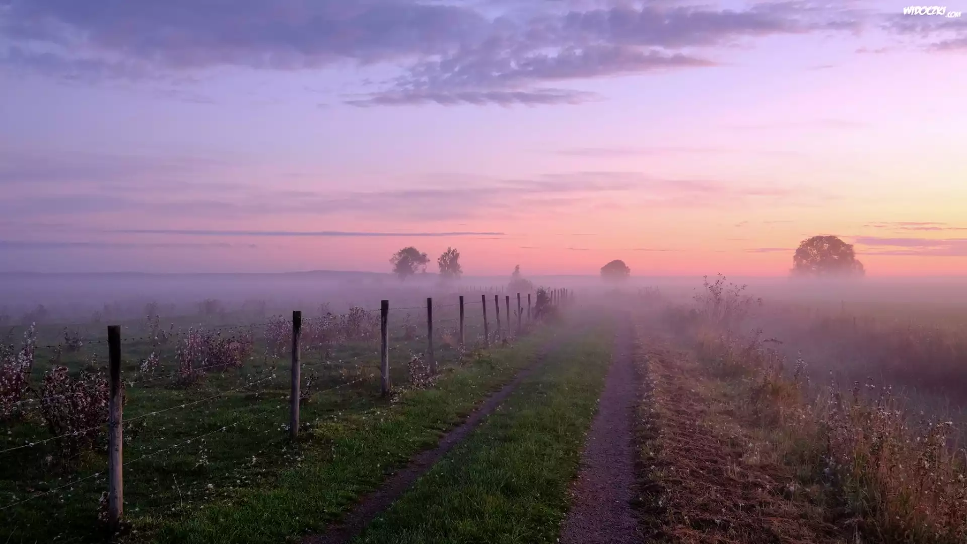Zdjęcia, Wschód słońca, Mgła, Droga, Ogrodzenie, Łąki, Drzewa