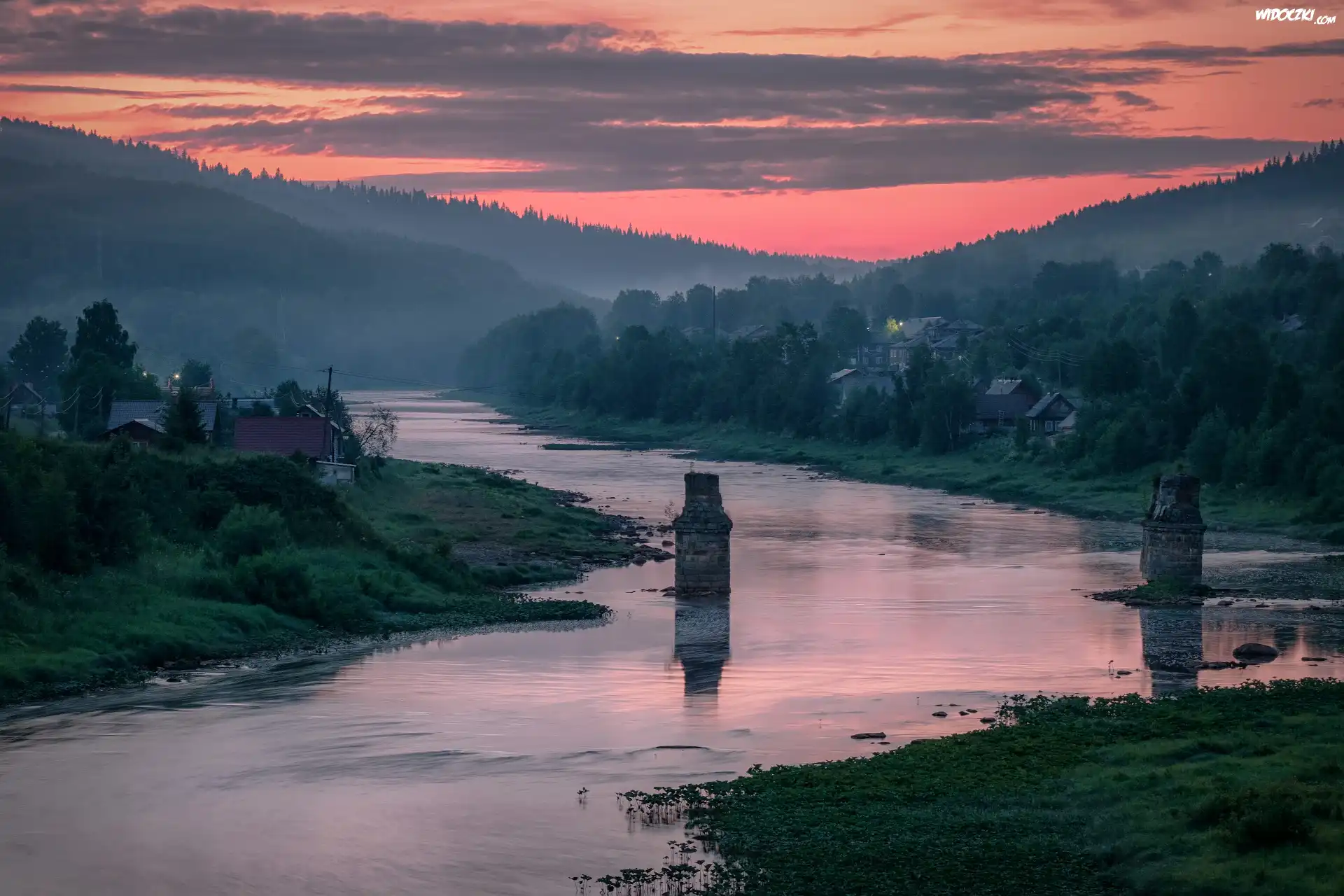 Wschód słońca, Góry, Rzeka, Drzewa, Domy, Mgła
